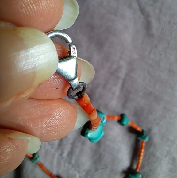 This vintage Native American necklace is made of small turquoise nuggets in similar shapes and sizes, interspersed with natural red coral beads. A simple necklace that is quintessentially Southwest, to use as part of a layered look. 18" choker with large Sterling silver lobster claw closure. Hallmarked. Handmade. Navajo.