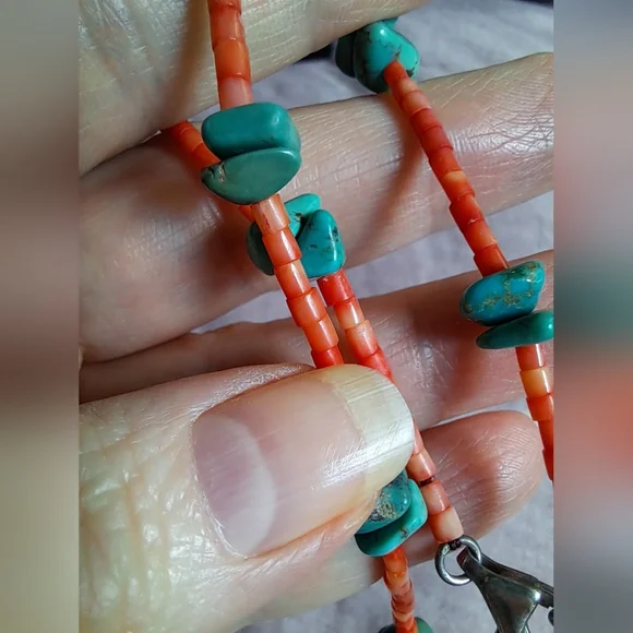 This vintage Native American necklace is made of small turquoise nuggets in similar shapes and sizes, interspersed with natural red coral beads. A simple necklace that is...