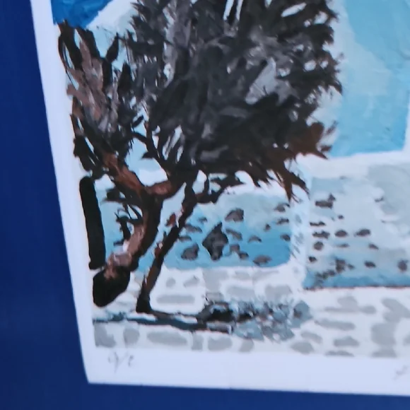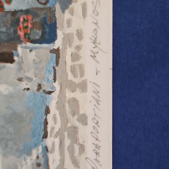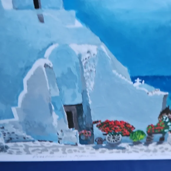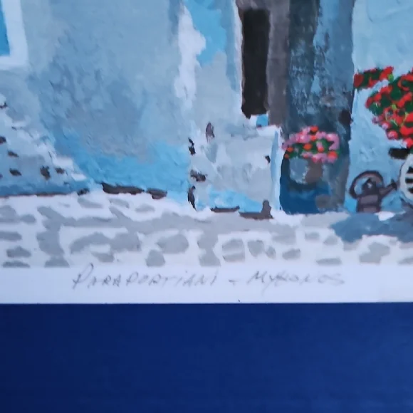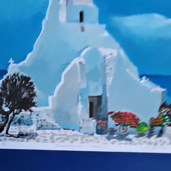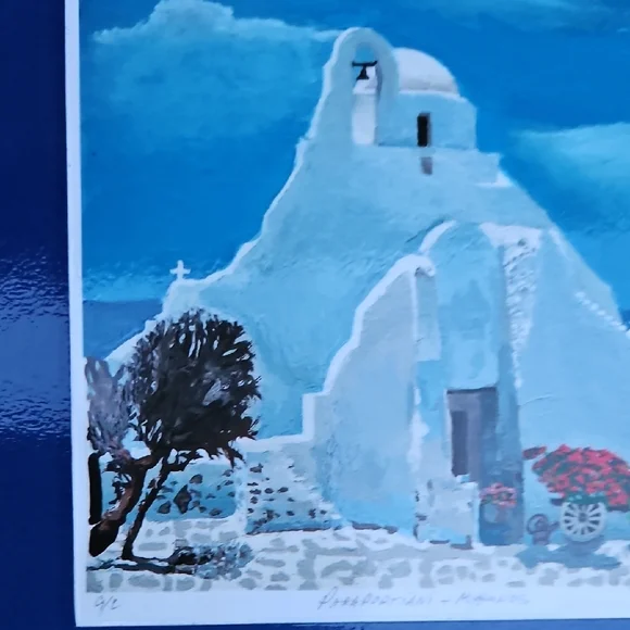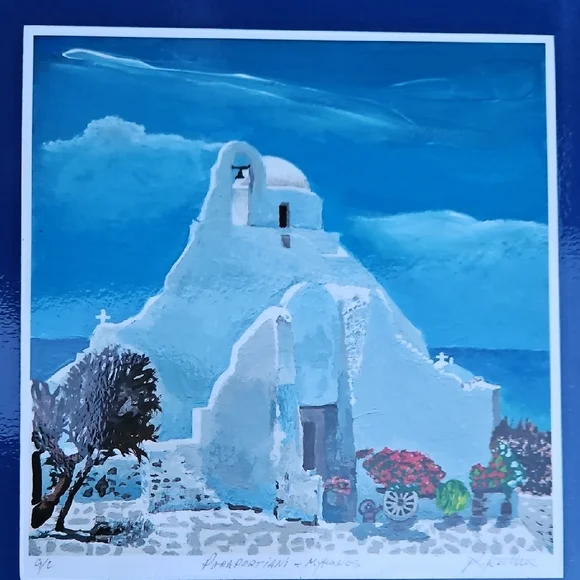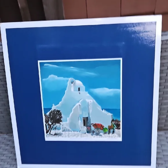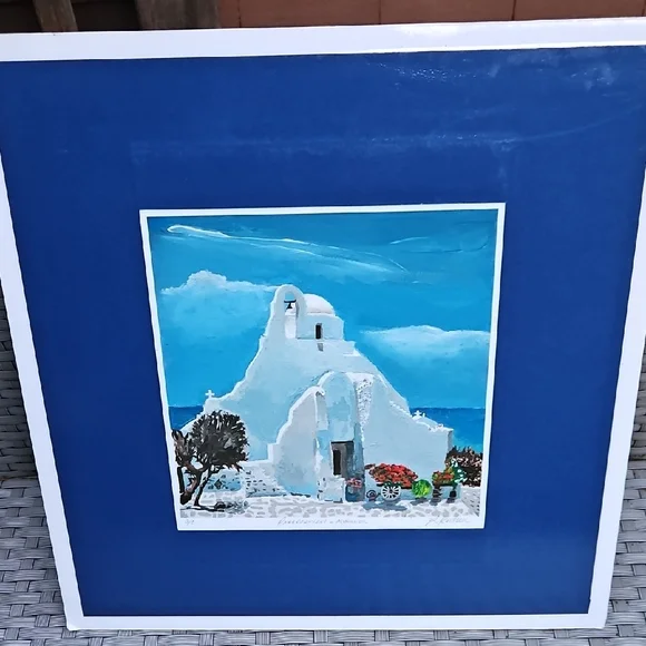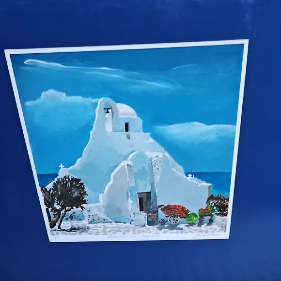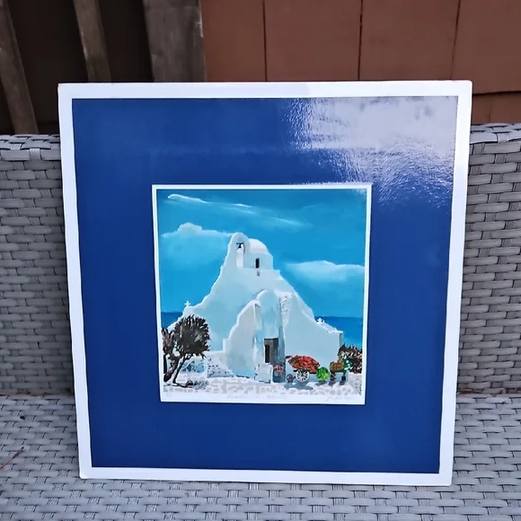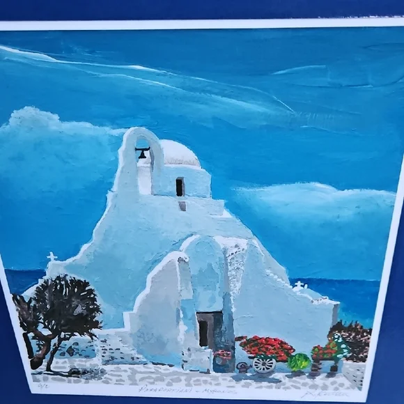 PRINT SIZE= 8.5 X 8.5 INCHES.SIZE WITH BLUE MATTING= 15.5 X 15.5-inch appox. USE WITH CURRENT BLUEMATTING. ORCUT OUT PRINT ANDFRAME.Vintage Art Print Artist Rick Koestler Paraportiani Church in Mykonos, GreeceThe art print in the image is of the Paraportiani Church in Mykonos, Greece. It is a whitewashed building with a bell tower and a cross overlooking the Aegean Sea. Enhance your decor with this stunning Greeklandscape art print. The vivid blue and white hues bring a touch of elegance and tranquility to any room.