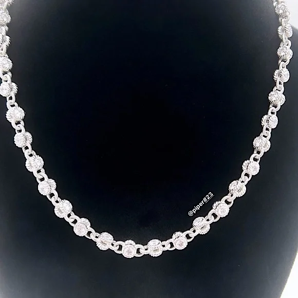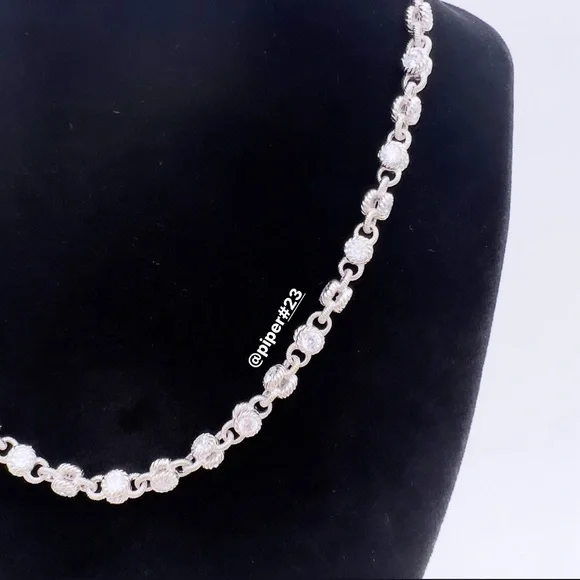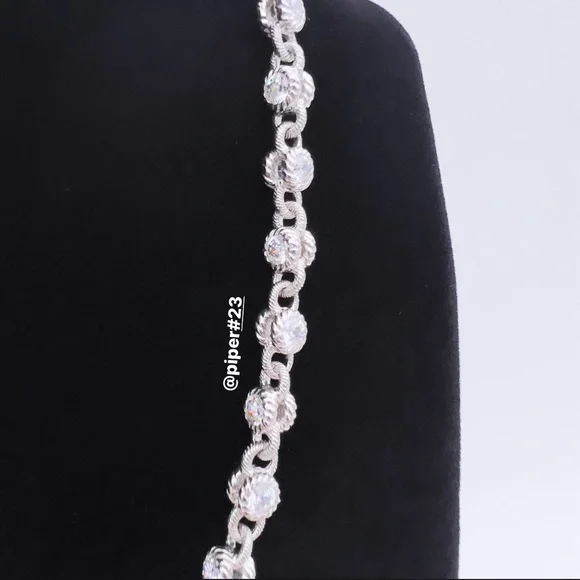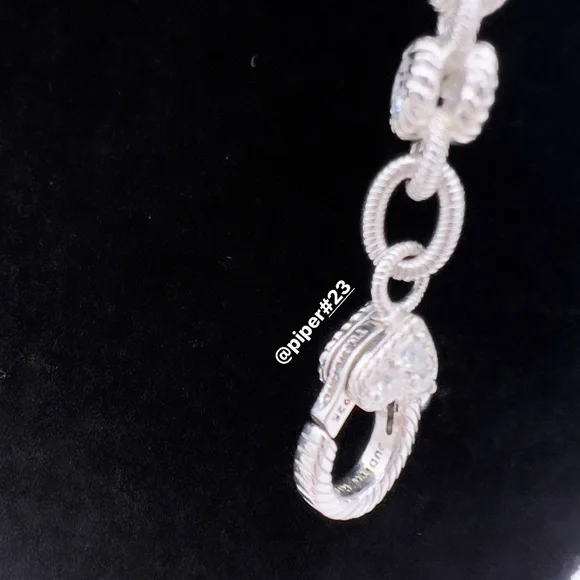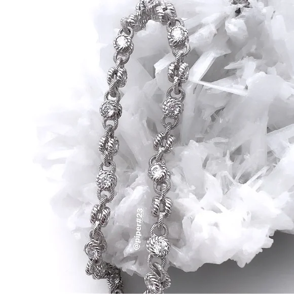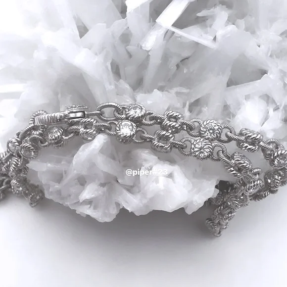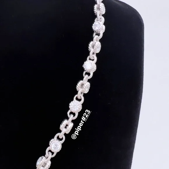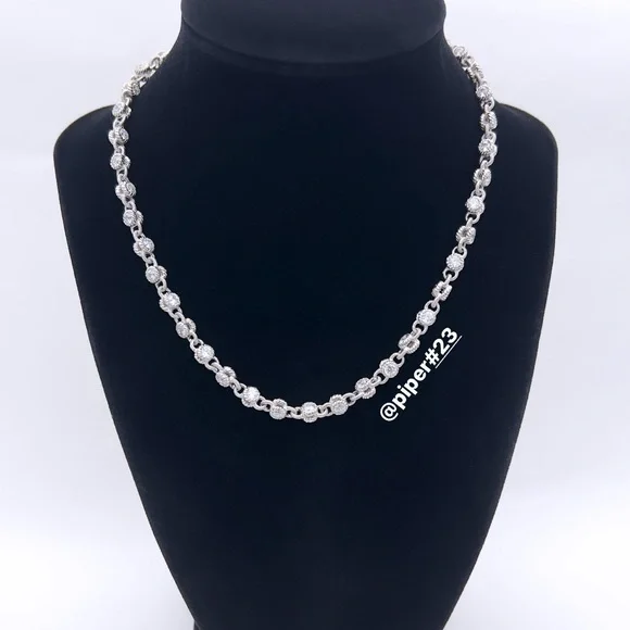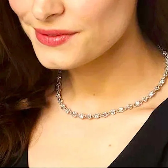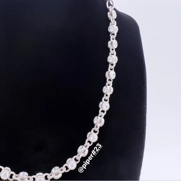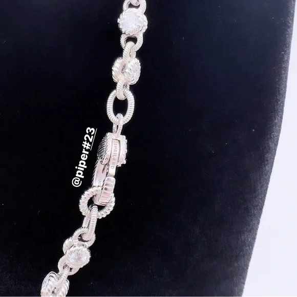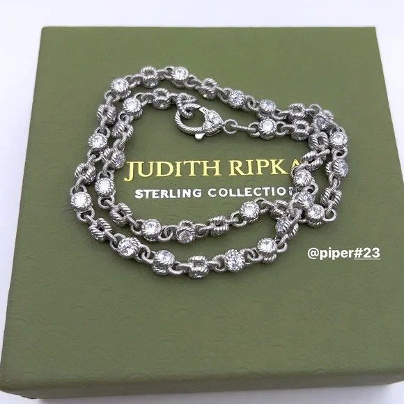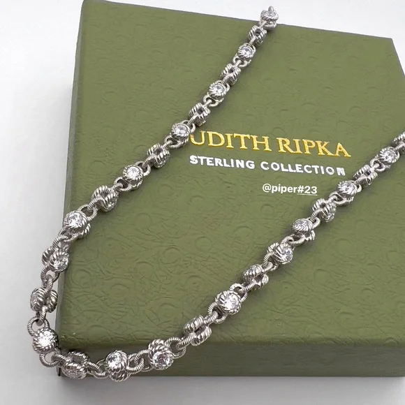 Beautiful Brand New Judith Ripka Necklace with round, double-sided stations of 100-facet Diamonique, created for exceptional sparkle!A total of 12.85 carats of round, bezel-set “100-facet”Diamonique simulated Diamonds The 100-facet Diamonique was made to actually have 100 facets to create exceptional sparkle when moving against the neckAlternating textured links creates a rolling effect against the neck for beautiful movementRhodium-plated 925 Sterling SilverLobster claw clasp closure accented with round, bead-set DiamoniqueNecklace is 16” long x 3/16”Substantial weight of 40 gramsMSRP of $435Made in Thailand Comes with logo box, pouch and romance cardNext day shipping