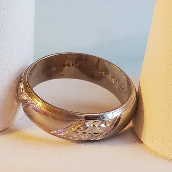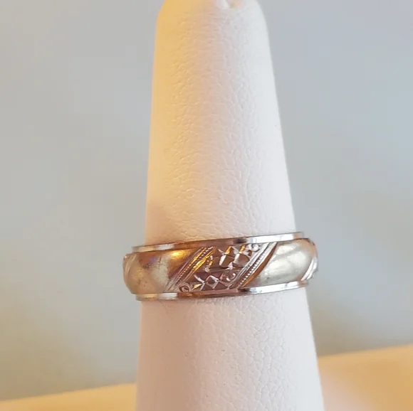 Unisex, Vintage, Marked 14k Keepsake, size 7, 6mm wide, beveled edge, cigar band with etched detailing, 5g white gold**Engraved on the inside EBJ to CSJ 5/17/60Keepsake is one of...