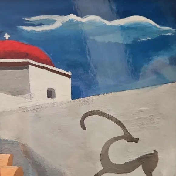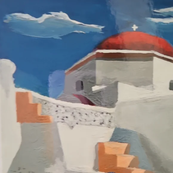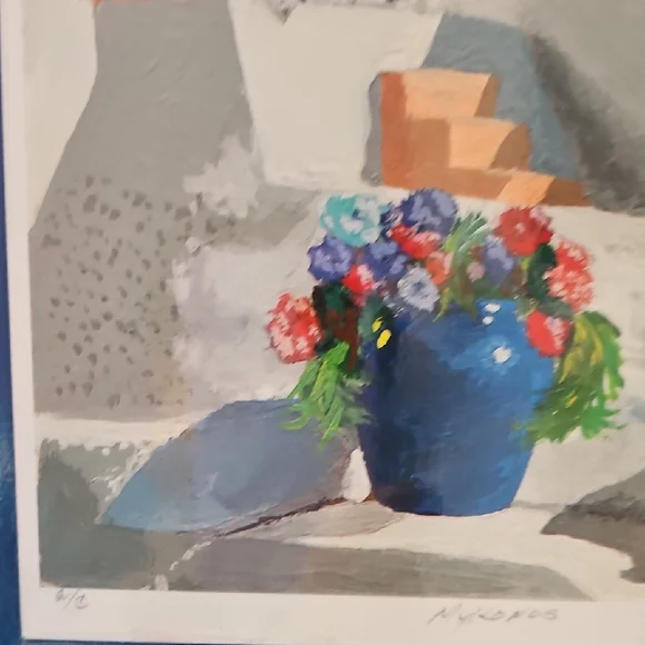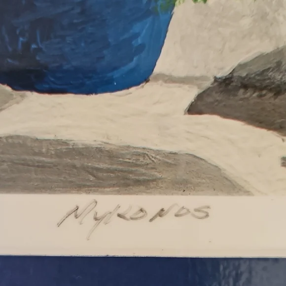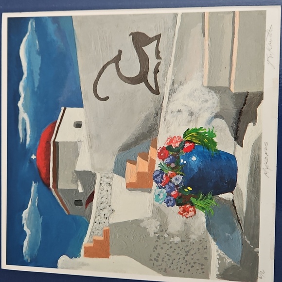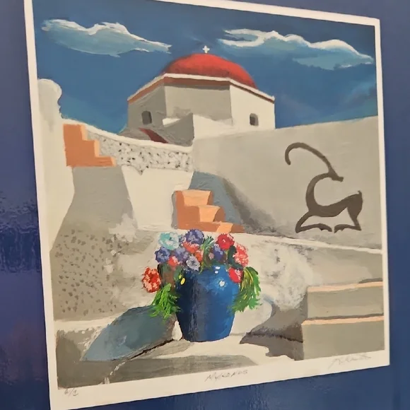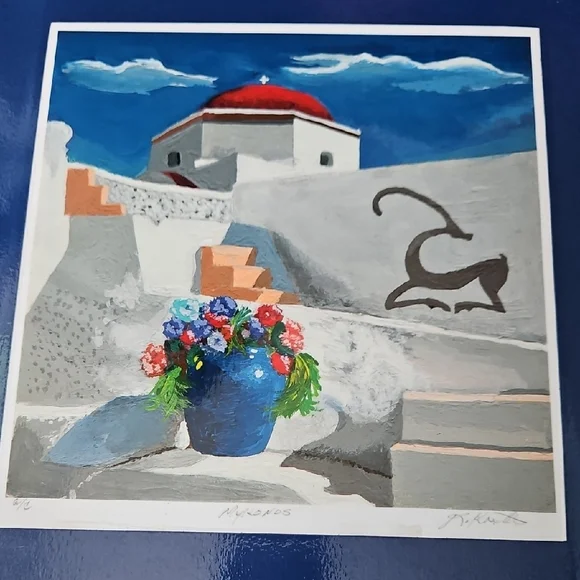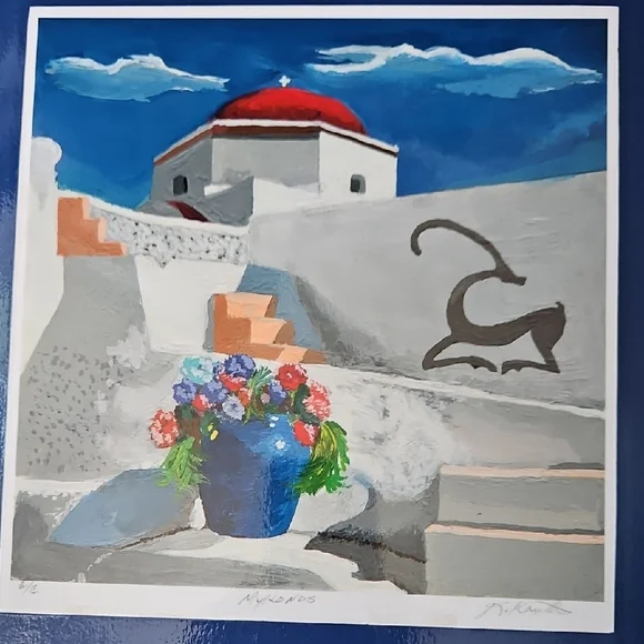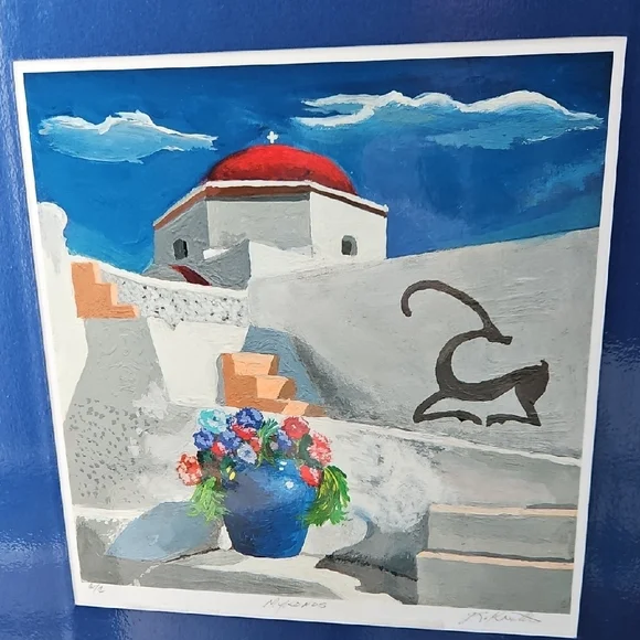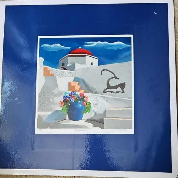 PRINT SIZE= 8.5 X 8.5 INCHES.SIZE WITH BLUE MATTING= 15.5 X 15.5-inch appox. USE WITH CURRENT BLUEMATTING. OR CUT OUT PRINT ANDFRAME.Mykonos by Rick Koestler. It appears to be a painting featuring a stylized depiction of a Greek island with a blue pot of flowers in the foreground . The artwork also includes a stylized depiction of a goat. Enhance your home with this stunning Greek art print. Featuring a striking blue vase and vibrant floral accents, it brings a touch of elegance to any room.