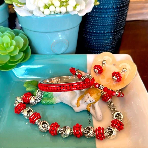 Ultra Rare HTF Brighton “GLOBAL DREAMS Red bead silver Necklace, 2 bracelets ( 1 is a Spellbound Bracelet but I love it together with that, but I can separate if you don’t want it and reduce price accordingly)& earrings! Bright, happy color and tribal craft work inspiration come full circle in this set with an every day appeal. Etched design outside rim decorated with beautiful red beads it’s a stunner! You won’t see this often add it to your jewelry collection today! Shop my closet with confidence I’m a level 2 Posh Ambassador ⭐️⭐️⭐️⭐️⭐️Star seller for lots more rare Brighton treasures your love. I love spoiling you and giving you outstanding customer service, so what are you waiting for come on in!Spring Summer EasterMother’s DayVacation July 4th Memorial Day GiftsGraduation Beaded BohoChic