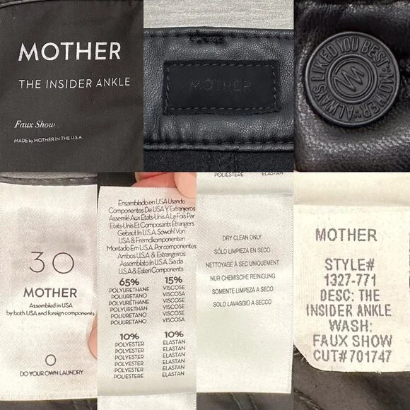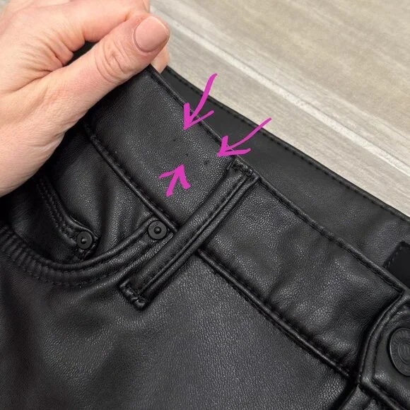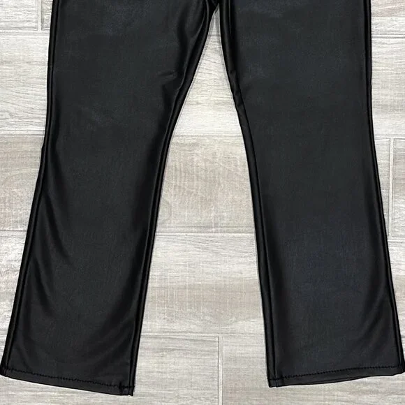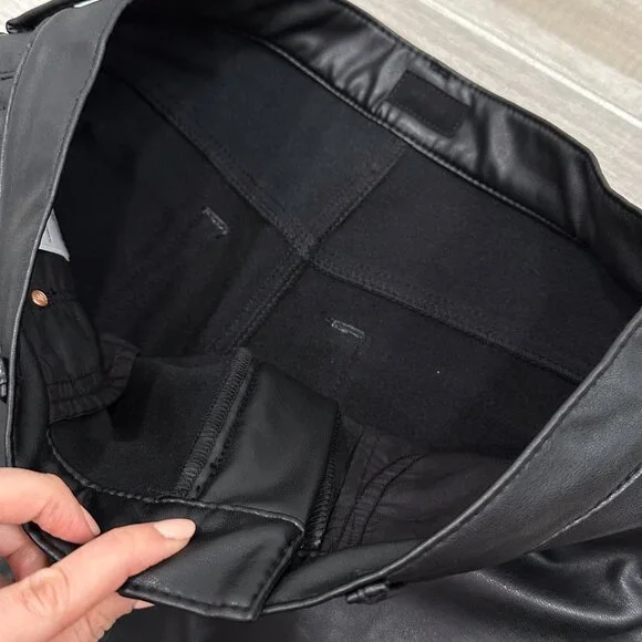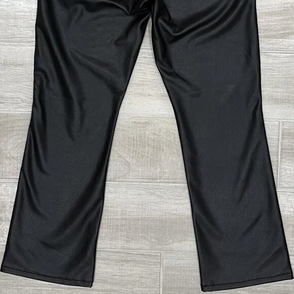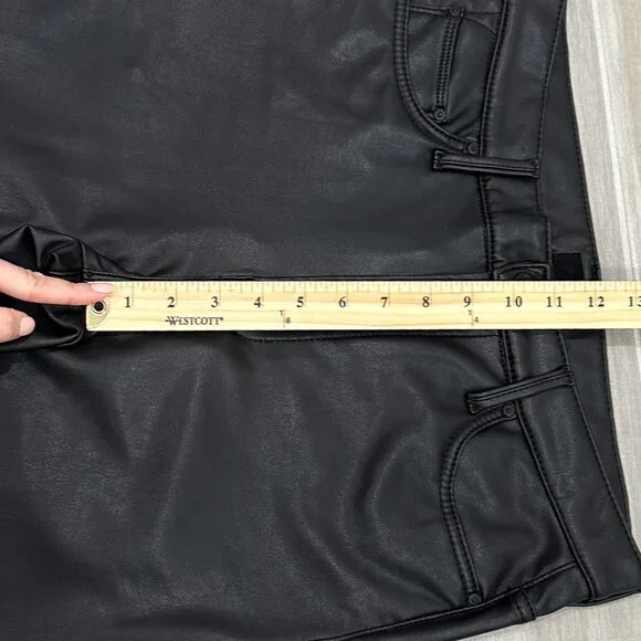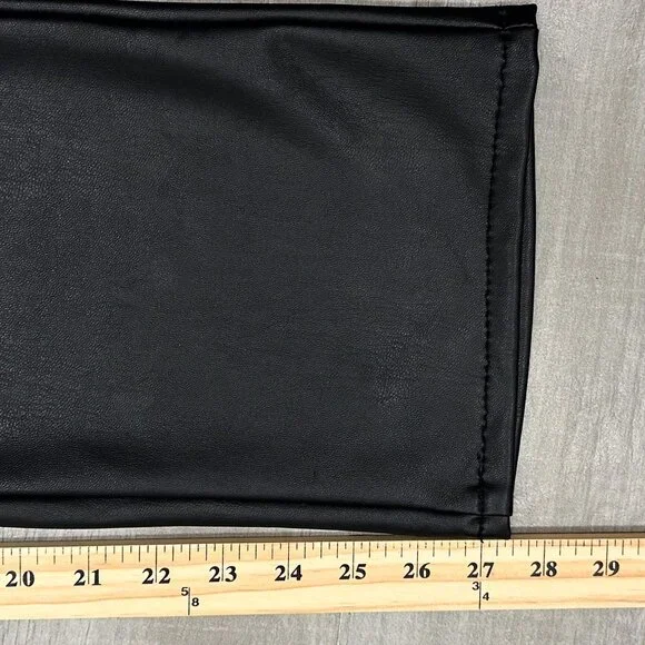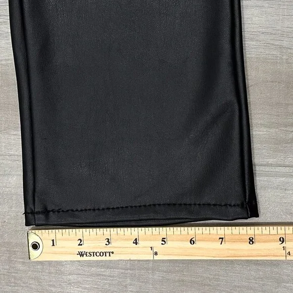 PRODUCT DETAILS: “Fabric: Mid-weight, super-stretch faux leatherMonochromatic designStraight, ankle-length silhouetteButton closure and zip fly5-pocket styling”CONDITION: Excellent used condition. 3 small pinholes in waistband, shown in last photo. The sewing at the hem is a bit wavy, not noticeable when worn. No other notable damages/flaws.MATERIAL: 65% Polyurethane 15% Viscose 10% Polyester 10% Elastane. Dry Clean Only. Made in the USA. MEASUREMENTS- IN PHOTOS (Waist, Rise, Hips, Inseam, Leg Opening)Hi, my name is Tara. I am a lover of all things fashion! I do my best to provide quality items at an affordable price. All pieces are hand picked by me and go through a quality check prior to being listed. If you have any questions, feel free to reach out and I will be happy to help. Please review the photos and measurements carefully, because returns are only accepted if something is damaged/incorrect in listing. Generally handling time is 1-2 days. Due to different monitors/screens, color of item may vary from the image. I do my best to edit the photo so that it shows the color as accurately as possible.All measurements are taken with garment lying flat and in resting position (not stretched).