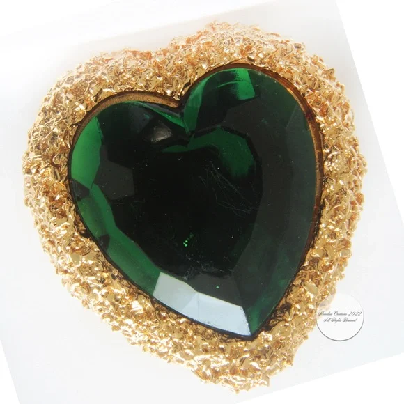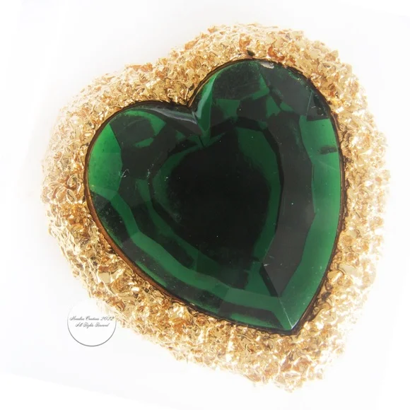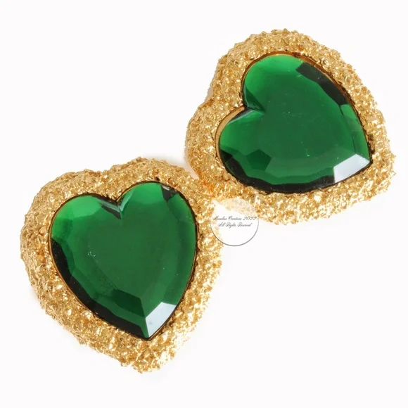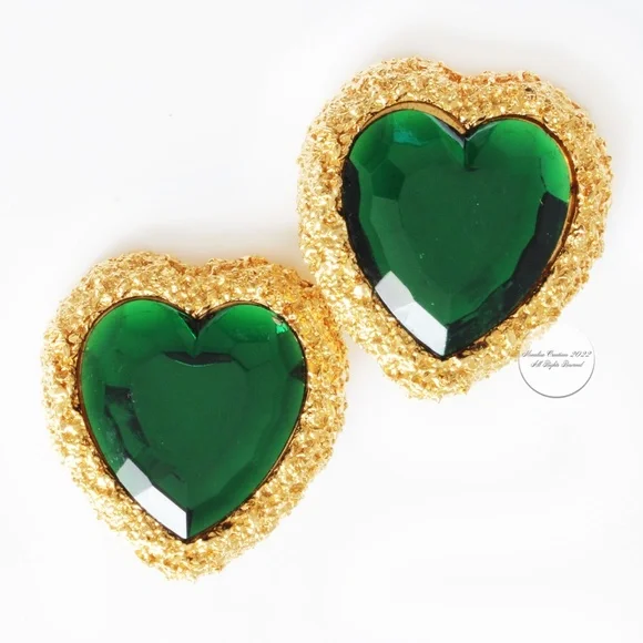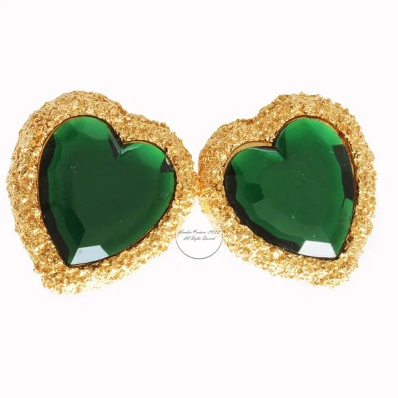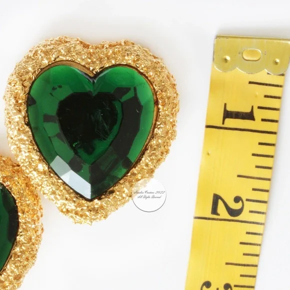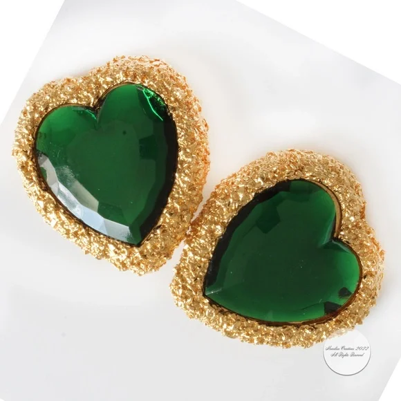 Authentic, preowned, vintage D´Orlan Massive Heart Earrings Clip Style Statement Emerald Green & Gold circa the 80s. Measurements appx 1.8in high x 1.5in wide. Amazing statement earrings! Stamped D´Orlan Made in Canada. Preowned/vintage with signs of prior wear: some color loss to edges, some scratches to green stones, hard to see when wearing but evident when inspecting closely.