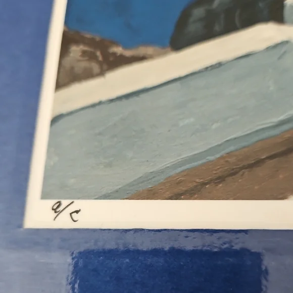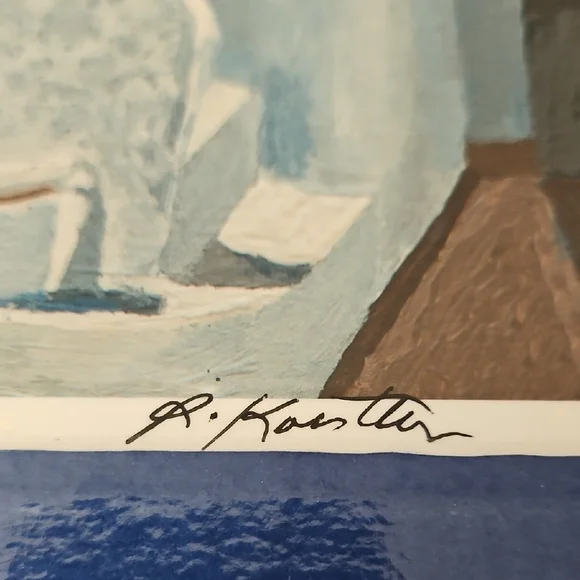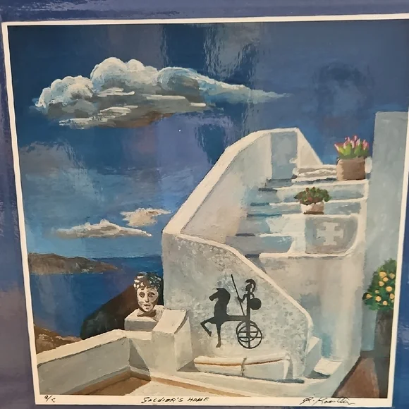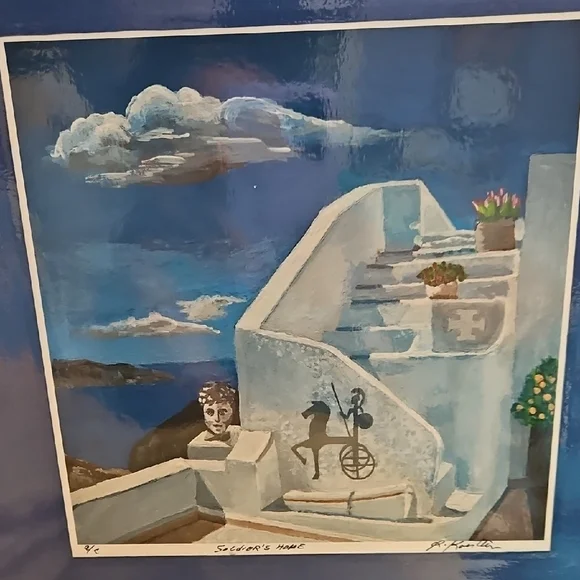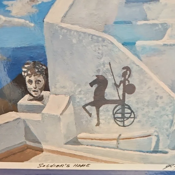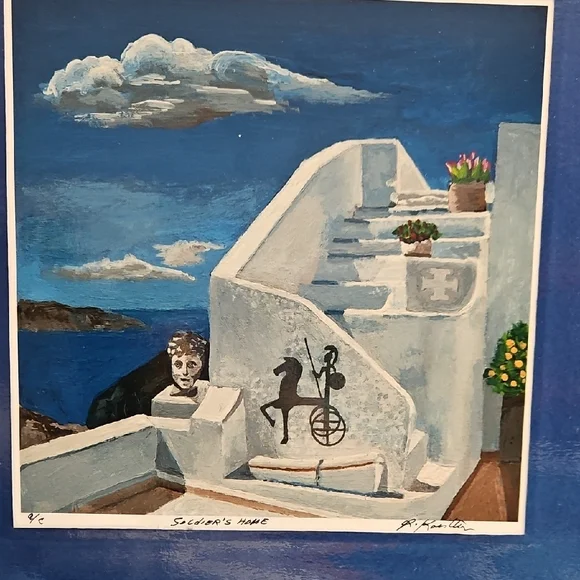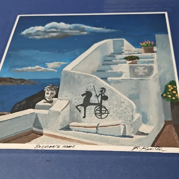 PRINT SIZE= 8.5 X 8.5 INCHES appox. SIZE WITH BLUE MATTING= 15.5 X 15.5-inch appox.USE WITH CURRENT BLUEMATTING. OR CUT OUT PRINT ANDFRAME.Vintage " Soldier´s Home" by Rick Koestler Greek Art Print Blue and White Hues"Soldier´s Home" by Rick Koestler depicts a scene reminiscent of a Greek island, possibly Santorini, with white-washed buildings, a staircase, and a figure of a soldier.This painting seems to be inspired by Ernest Hemingway´s short story of the same name, which explores the experiences of a soldier returning home from war and the challenges of reintegrating into civilian life.Transform your space with this captivating Greek art print. Featuring soothing blue and white colors, it brings a touch of coastal charm to your decor.