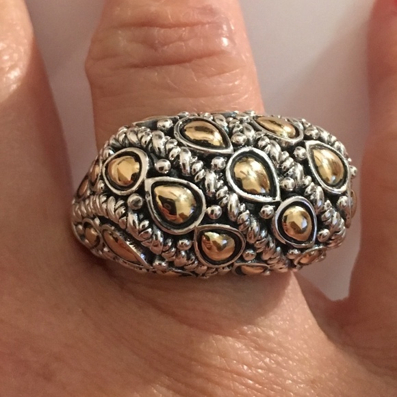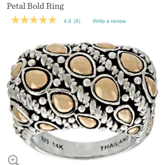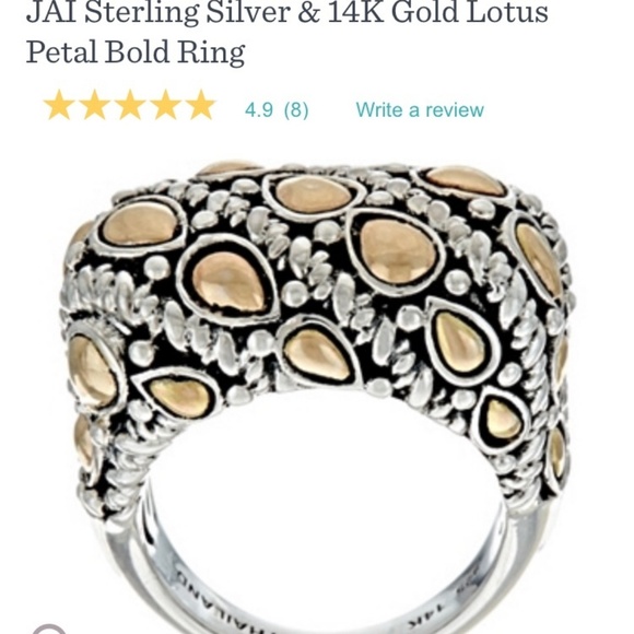 Retired JAI Sterling Silver & 14K Gold Lotus Petal Bold Ring New in box: Pretty 14K gold petals and shining sterling silver rope combine to create the bold design of this rounded, rectangular ring. From JAI. Polished, rounded rectangular silhouette with diagonal sterling silver rope designs and 14K yellow gold teardrop-shaped plongs; oxidized finish; screen baThis ring is very substantial, bold and beautiful but not over the top, a totally unique statement ring, to be treasured forever! :)