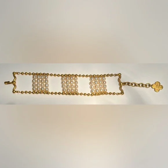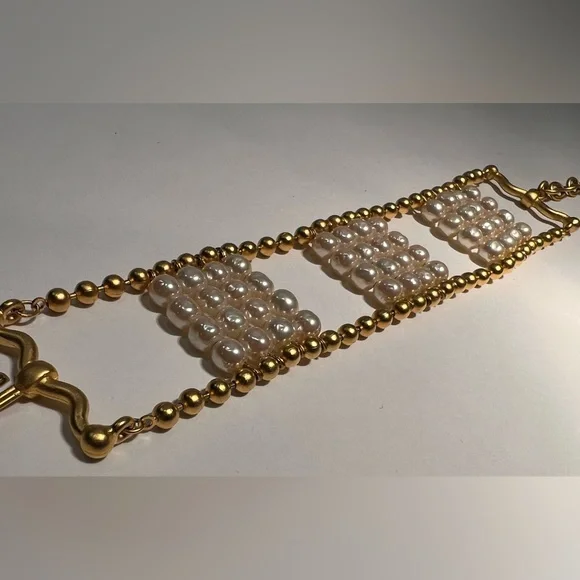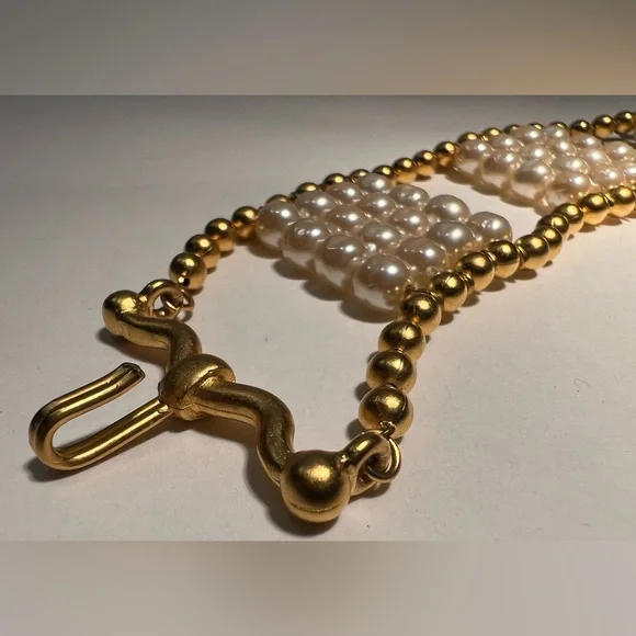 Vintage bracelet from Karl Lagerfeld bijoux, circa 1991Pretty and modern, this classic and unique bracelet has 6mm round Japanese glass light baroque pearls and 24kt gold plated ball chain, hook closure and extender chain with logo hang tag.Perfect condition - one owner