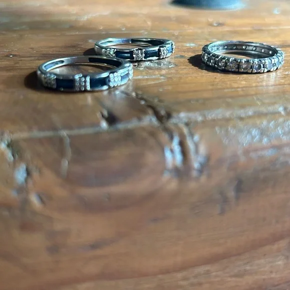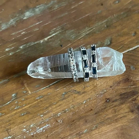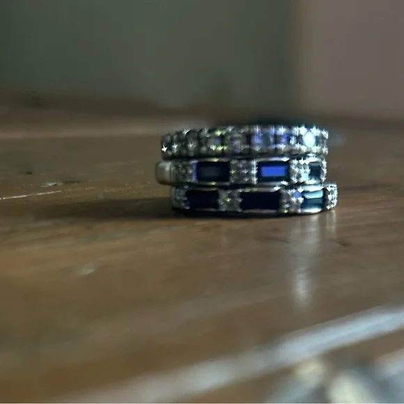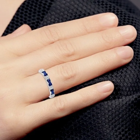 Sapphire Diamond 14k White Gold Anniversary BandsBlue baguette sapphires complimented by natural diamonds in an elegantly crafted anniversary band. 14K white gold1/2 carat sapphire each1/2 carat diamond eachProfessionally sized to 6 1/2 Listing is for 2 bands - shown with eternity, also listed. Stock image enhanced. Stones intact, excellent condition.