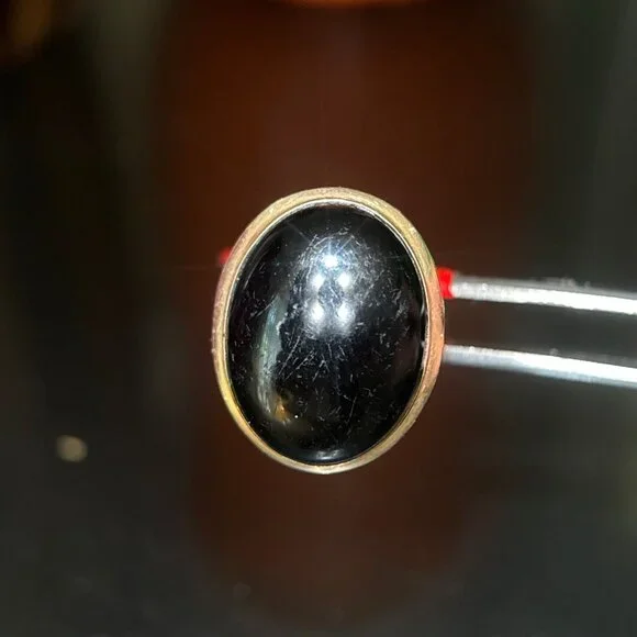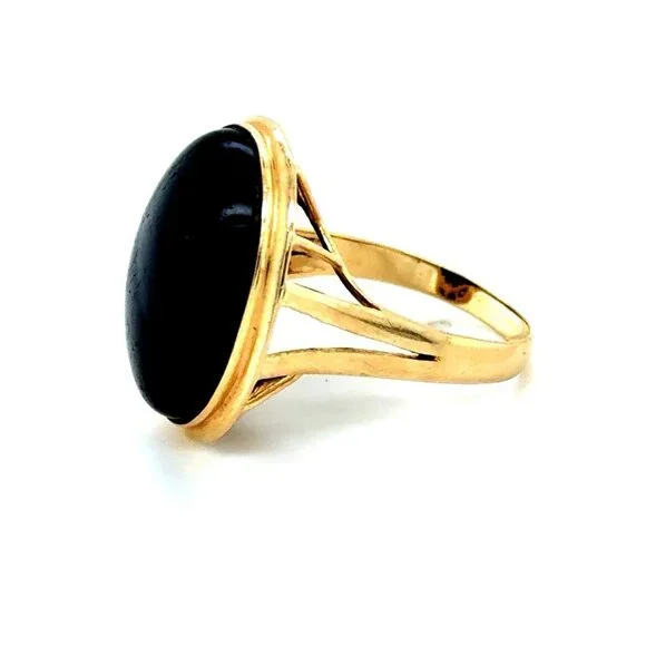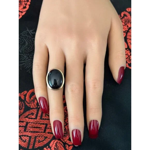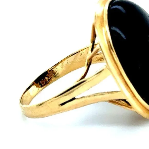 SPECIFICATIONS:Metal: 14k Yellow GoldMetal Stamp: 14K 585Size: 7Gem: Onyx Gem Size: 20x15mm approxWeight: 4.8gCondition: Preowned Real 14K Yellow Gold Vintage Onyx Ring, REAL GOLD, NOT GOLD PLATED OR GOLD FILLED.Stone has some scratches. Note: Pictures are enlarged to show fine details of the product.
