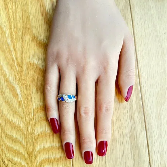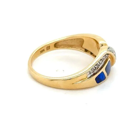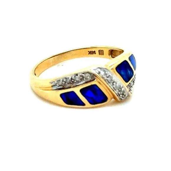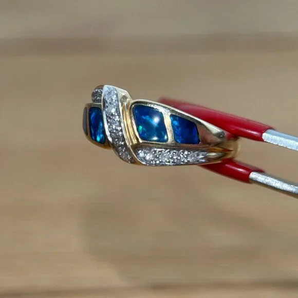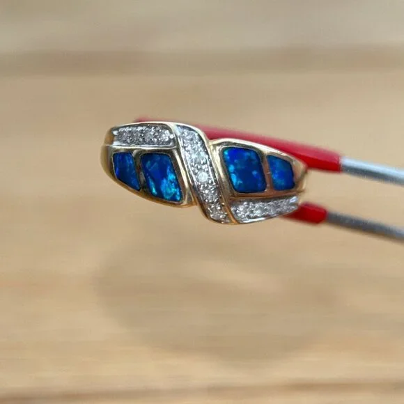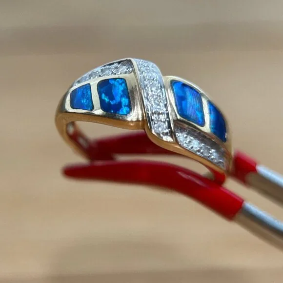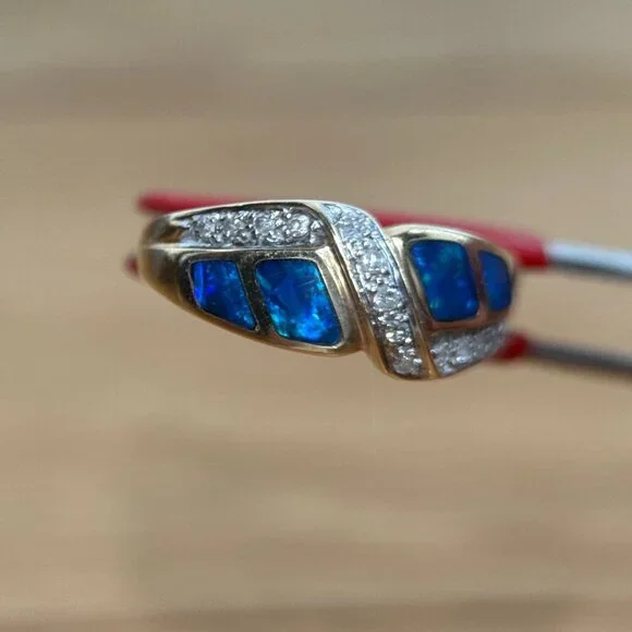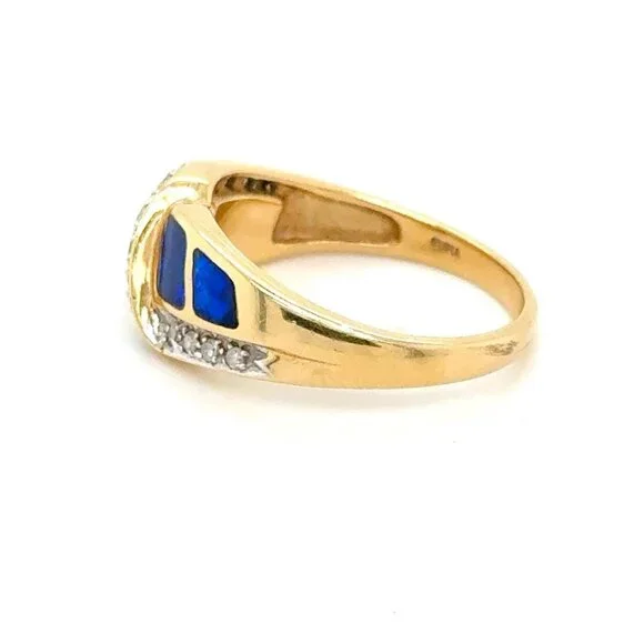 SPECS:Metal: 14k Yellow GoldMetal stamp: 14KSize: 7Weight: 4.3gCondition: PreownedReal 14K Yellow Gold Opal & Diamonds Ring, REAL GOLD, NOT GOLD PLATED OR GOLD FILLED.Note: Pictures are enlarged to show fine details of the product