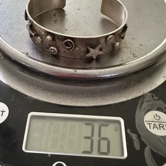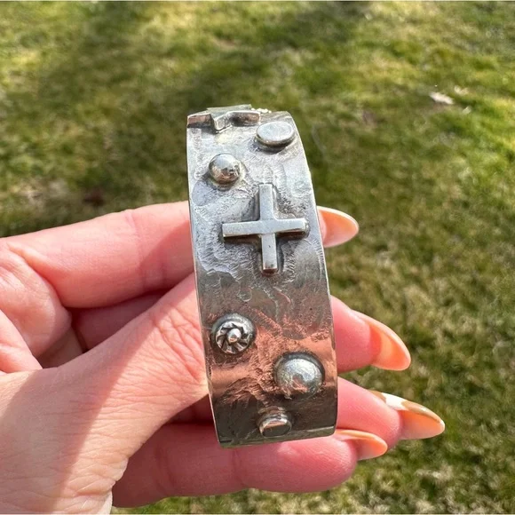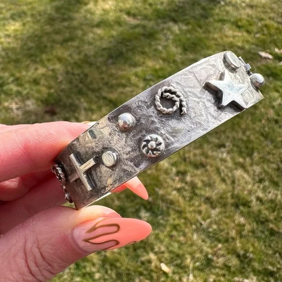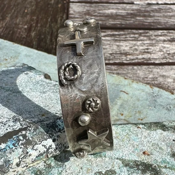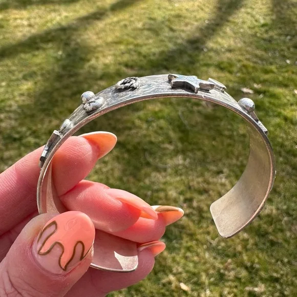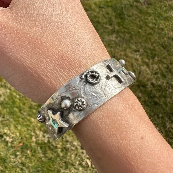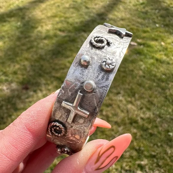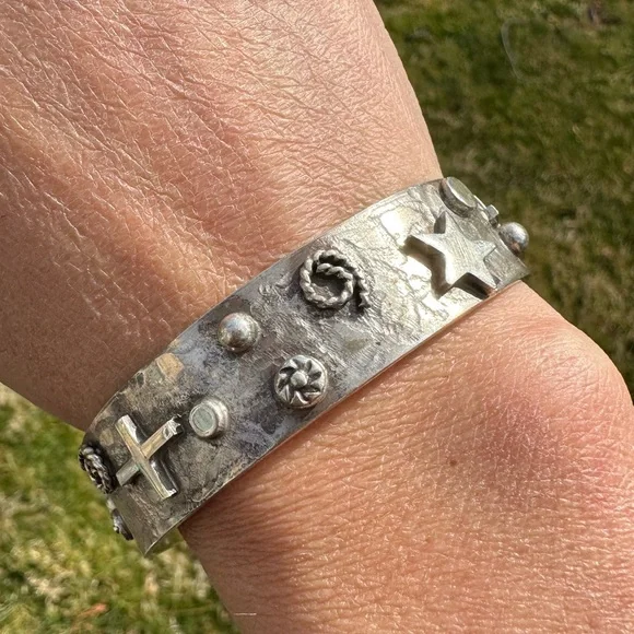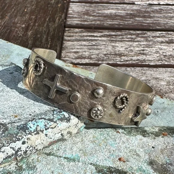 New without tags sterling silver southwestern cuff. Stars, crosses & swirls reminiscent of the night sky in a cowgirl approved cuff! Measures 5/8in wide, 5.75in end to end inner circumference plus a 1in adjustable gap. Weighs 36g- this cuff is great for stacking! Stamped sterling with artists initials RM.