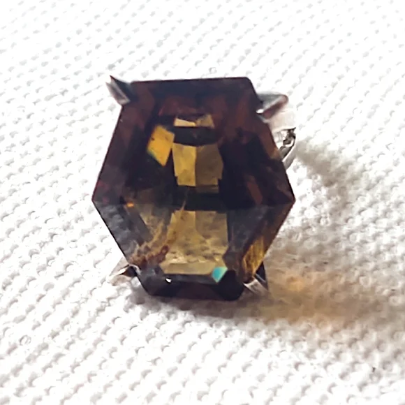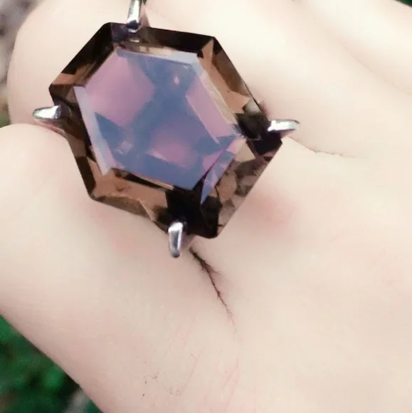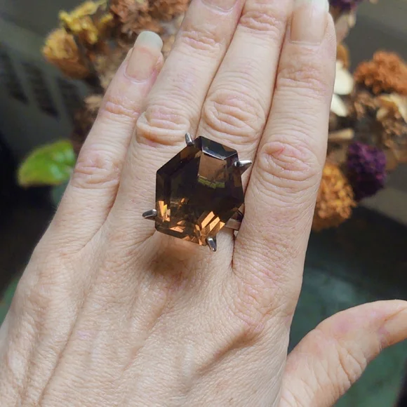 Oversized Vintage Smoky Quartz Sterling Silver Art Deco Estate Cocktail Ring. Size 7.75. Hexagonal Face of the gemstone measures approximately 1.2" x .75" with a depth of about...