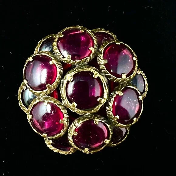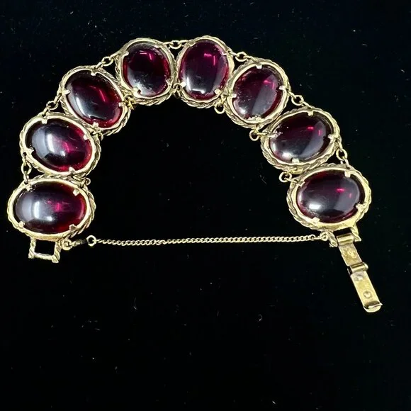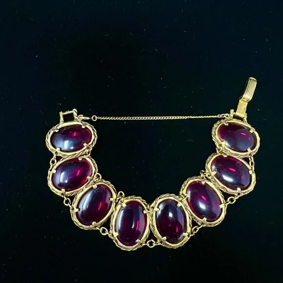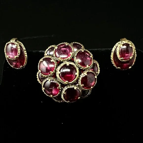 Set includes a pair of clip earrings, bracelet and pendant / brooch.Gold tone metal with cranberry / burgundy color glass.All are in good operable condition.There are a some tiny...