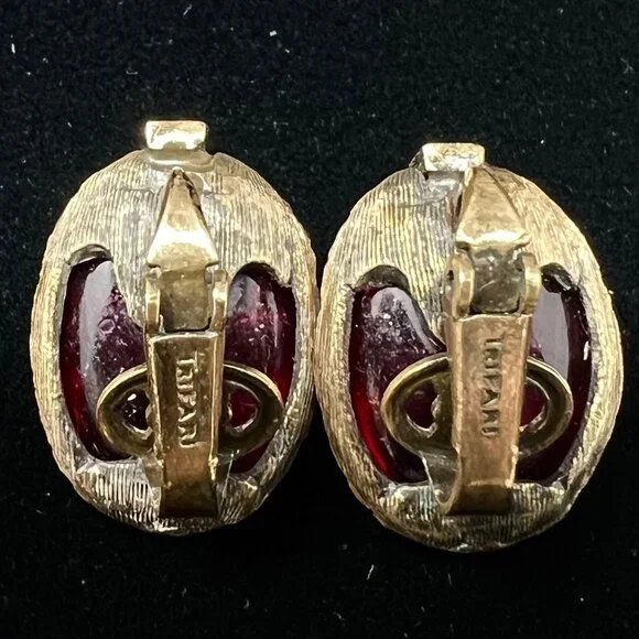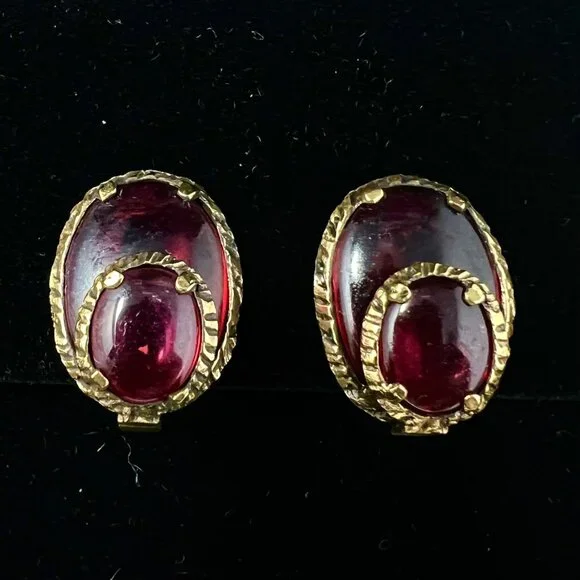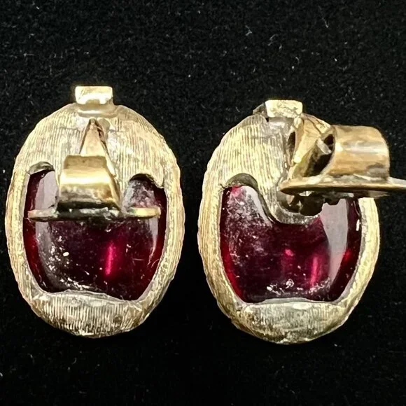 Set includes a pair of clip earrings, bracelet and pendant / brooch.Gold tone metal with cranberry / burgundy color glass.All are in good operable condition.There are a some tiny scratches on a couple of the the glass pieces.Please inspect the pictures closely for condition details.The glass has an interesting texture to it that carries through on all the pieces and is not a condition issue or a flaw.Returns will be accepted if the following condition are met:* Item(s) must be returned in the same condition as listing pictures.* Item must be packed for return the same as was shipped to them.* Item must be received by the seller and inspected before refund will be initiated.Failure to meet ALL these requirements will result in a Partial refund or NO REFUND.Features:• Clip On Earrings, Safety Chain Bracelet, Pendant/PinCondition: Pre-Owned Good