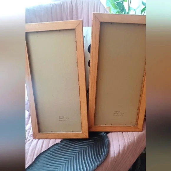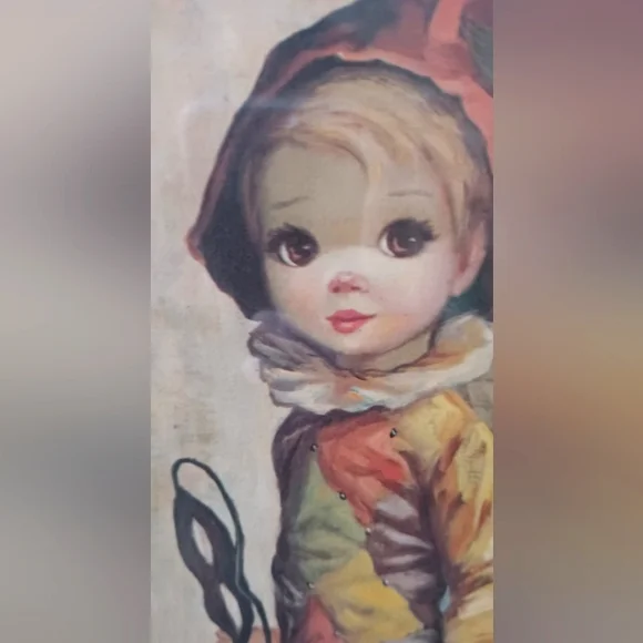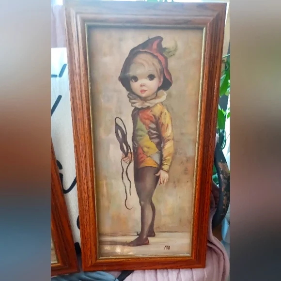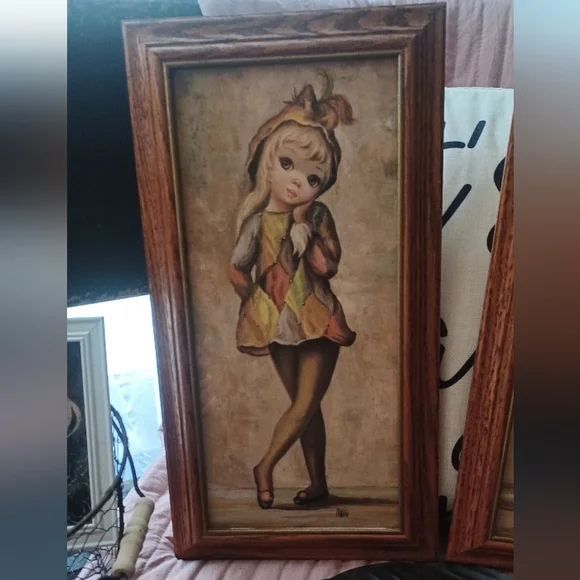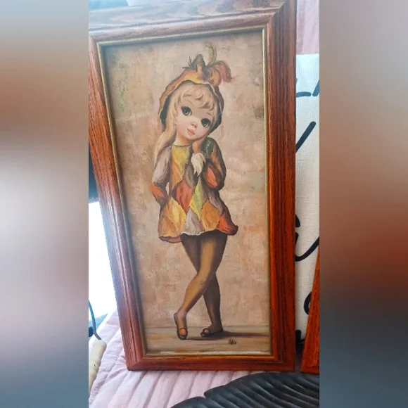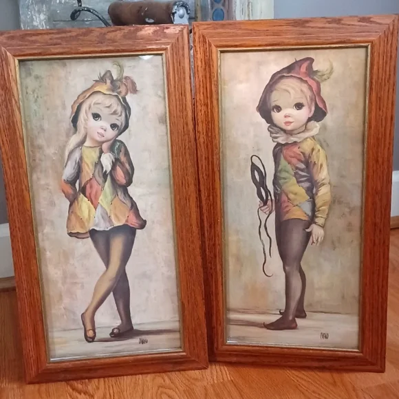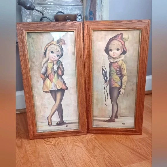 Charming vintage art Jean Maio 1960s prints featuring harlequin characters. Set in elegant vintagewooden frames. Perfect for adding a whimsical touch to any room.