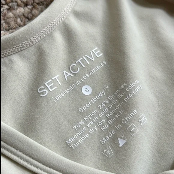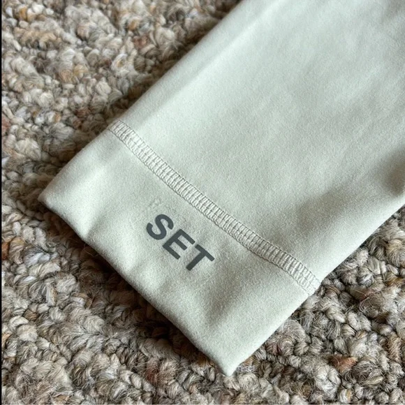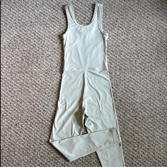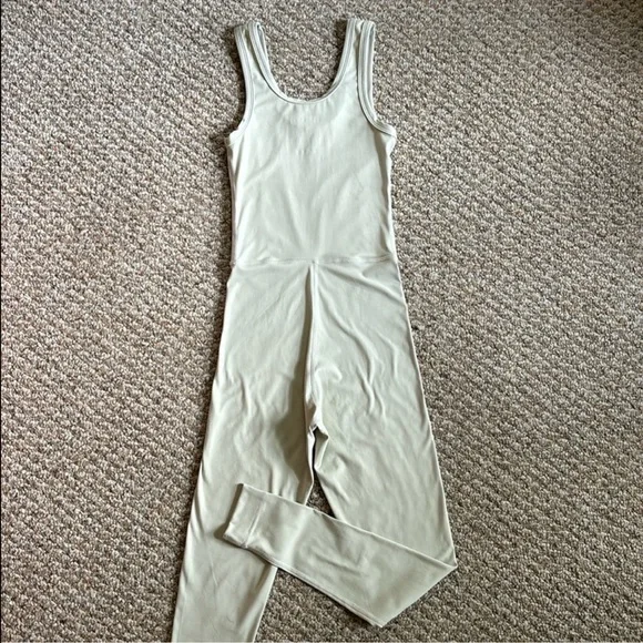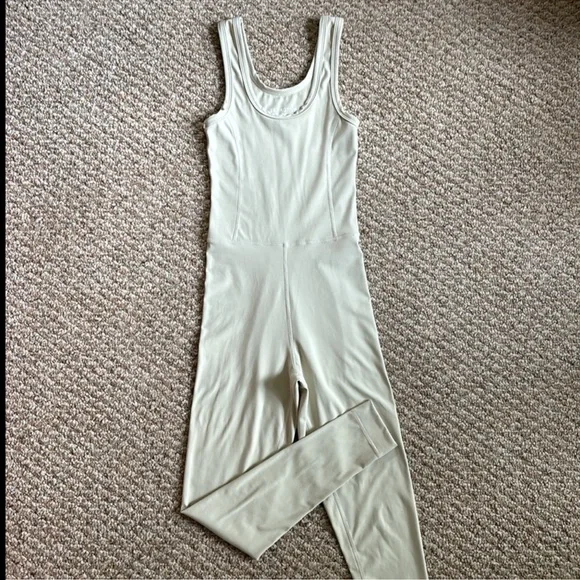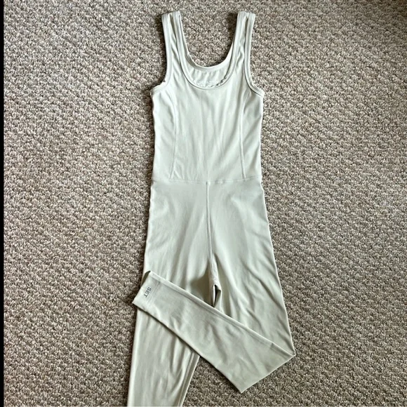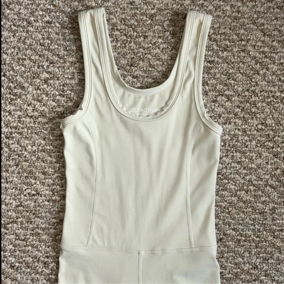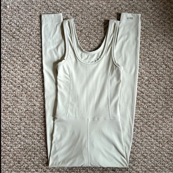 Set Active Sportbody Jumpsuit Oat Milk Set Active activewear jumpsuit In the color oat milk, a creamy beige color w/ a light sage green undertone Features flattering contour seaming in a body hugging fit, a scoop neckline, thick tank straps, and SET ACTIVE reflective logo at the ankle Designed w/ buttery soft four way stretch fabric that’s sweat and moisture wicking and No longer sold on website In excellent gently used condition, no flaws, rips, or stains