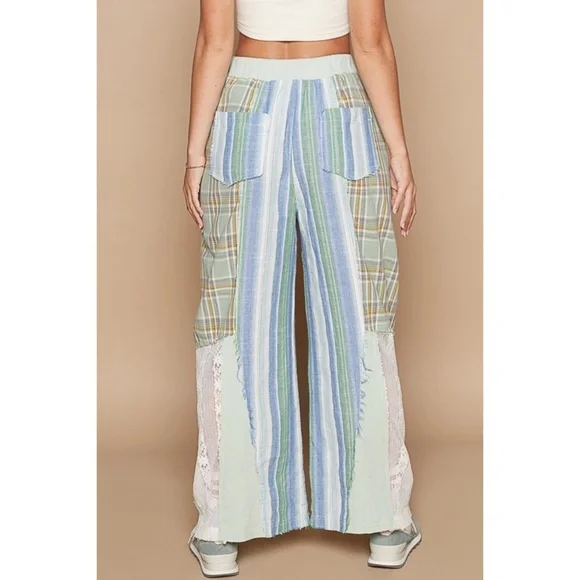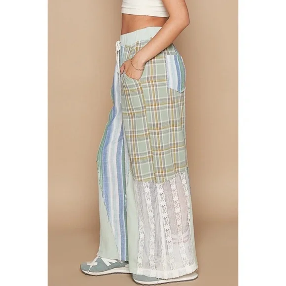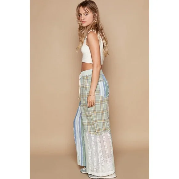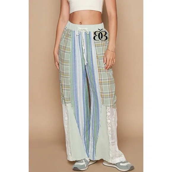 POL Blue & Green Washed Cotton Plaid with Stripes Lace Leg Pants BRAND NEW - Also Available in Pink & NaturalFeaturesRelaxed FitPatchwork Mix of Plaid, Stripes + LaceWide Elastic...