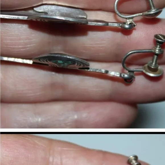 These stunning earrings feature a stylized bird design crafted in silver, adorned with vibrant green inlay. The intricate detailing and unique shape make them a standout accessory for any occasion. Vintage Navajo handmade Peyote bird screw backs.