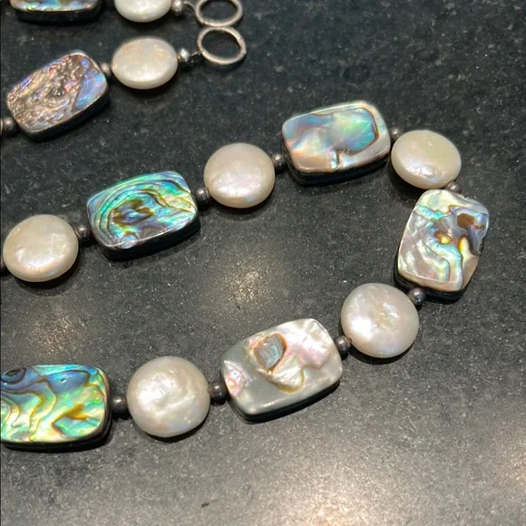 This stunning jewelry set features abalone and pearl elements, offering a unique blend of iridescent colors. Perfect for adding a touch of elegance to any outfit.