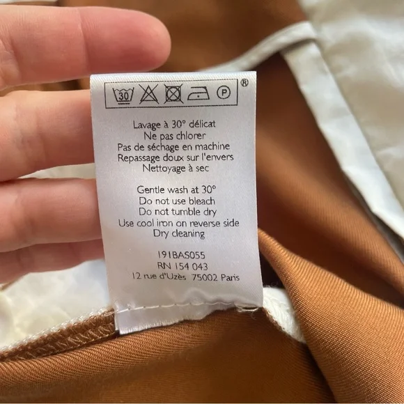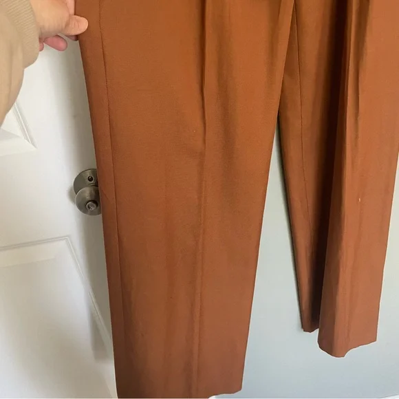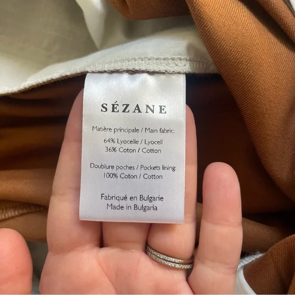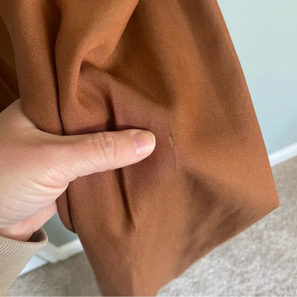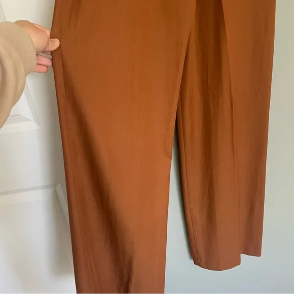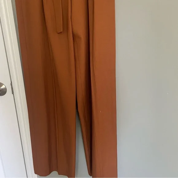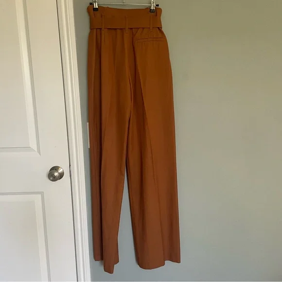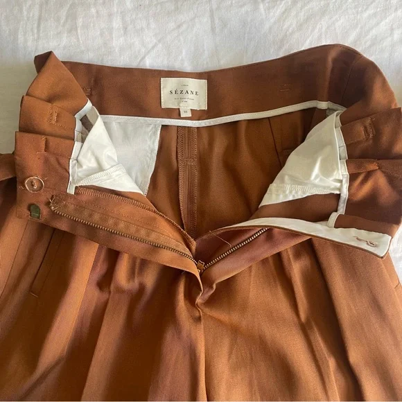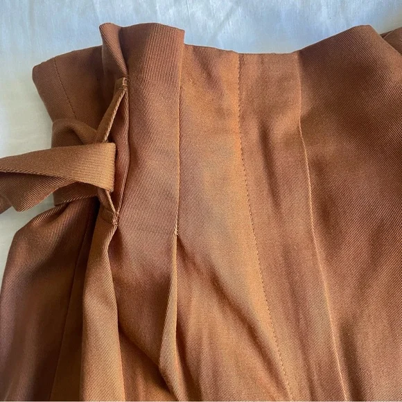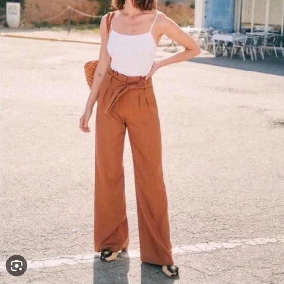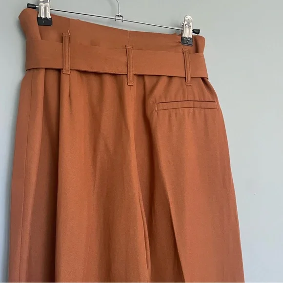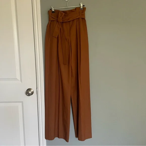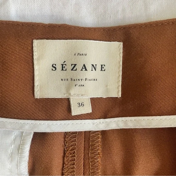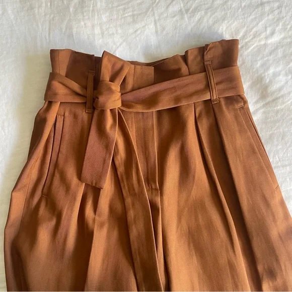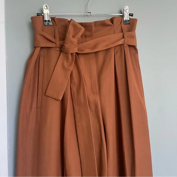 Sezane Arthur Pant in Cafe Brown Belted Wide Leg Trouser Paper Bag Waist PleatedGorgeous wide leg trousers from Sezane, the Arthur pant features a high rise waist with slight paper bag pleating at the top which creates some gorgeous lines down the leg. Easy to dress down or up, they look great with sneakers!Wide legLovely, luxurious fabric. Hang beautifully.Tie waist that can be removed.Side and back pockets.French 36 sizing is approximately a 4 in US Womens. Waist measurement is 13.5”. Rise is 14”. Inseam is 34”.All measurements are approx and laying flatExcellent preloved condition! No holes or stains.One small imperfection in stitching below front left knee and right hip pleat. (see photos) Color may vary slightly due to lighting.Personally, I think this color is more like a cooper penny with a hint of gold/orange. Stock photos are shown for reference only.