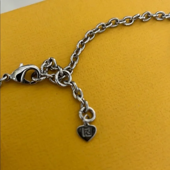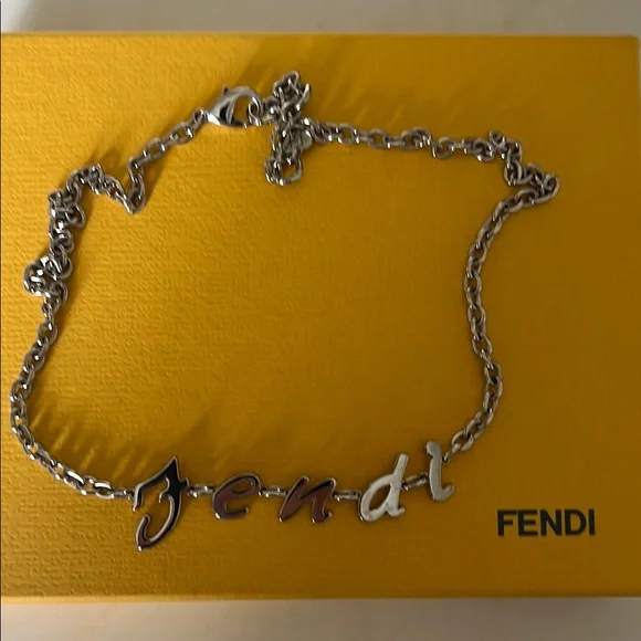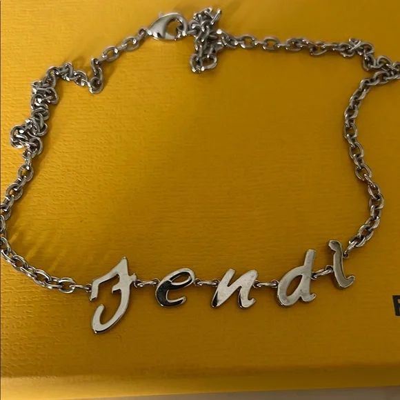 Stylish Fendi necklace with a silver chain and logo design. Adds luxury to any look.