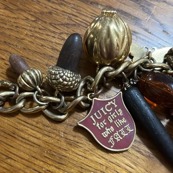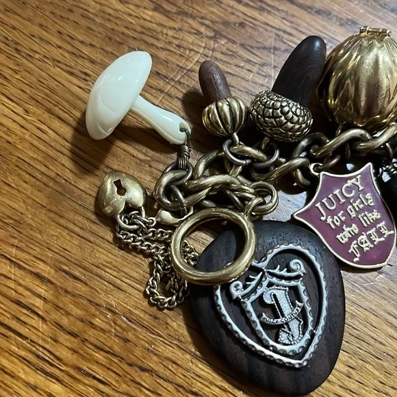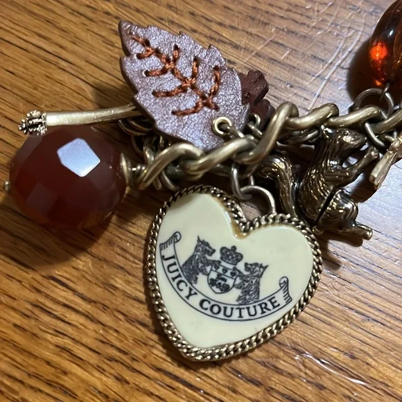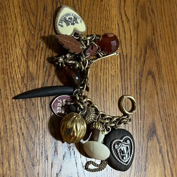 This vintage charm bracelet features a collection of 14 unique charms in gold and brown tones. Perfect for adding a touch of classic style to any outfit. 7” in length. Prefixed, charms are non-removable. This is a hard to find, very rare Juicy Couture bracelet. Does not have the original box, but it will be placed securely in a box prior to shipping.