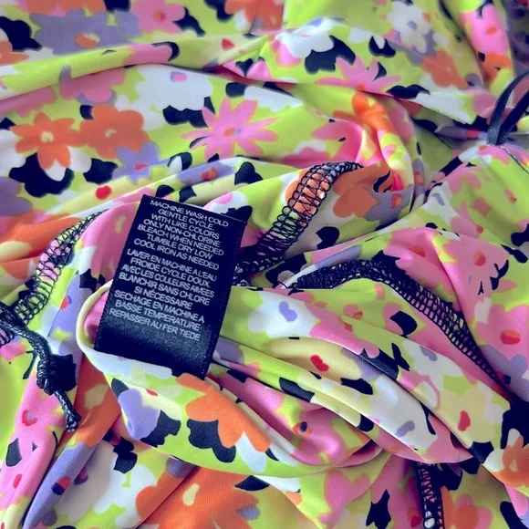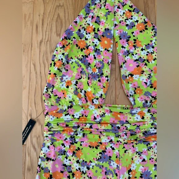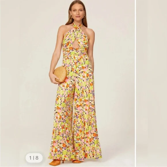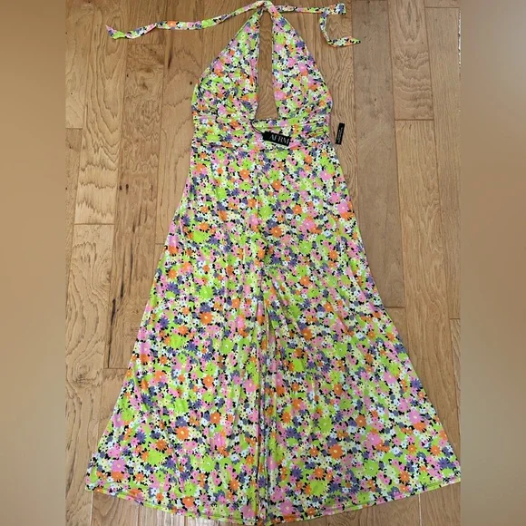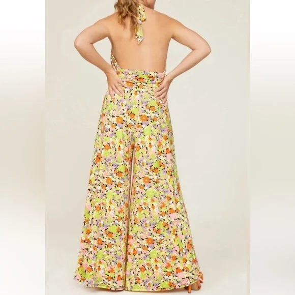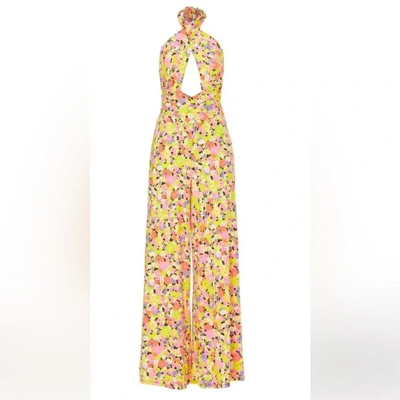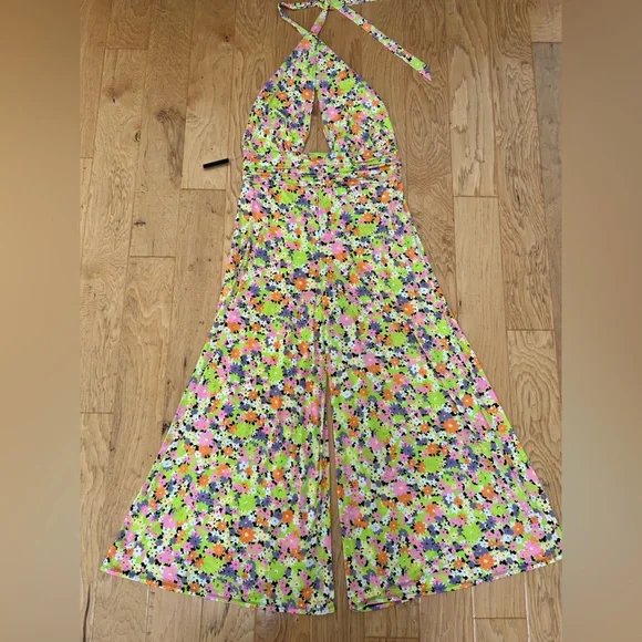 AFRM Pamela Slinky Floral Jumpsuit in size X Large New with tags Spring Lime Ditsy, bright yellow, pink, orange & neon green Halter Wide lined legs Measures about (plus stretch)...