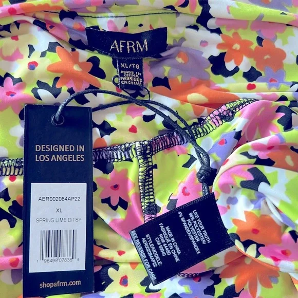 AFRM Pamela Slinky Floral Jumpsuit in size X Large New with tags Spring Lime Ditsy, bright yellow, pink, orange & neon green Halter Wide lined legs Measures about (plus stretch) Waist 17 1/2”Inseam 31”Color may vary due to lighting Ships same day by 2 pst Smoke free Pet free Tag, spring summer