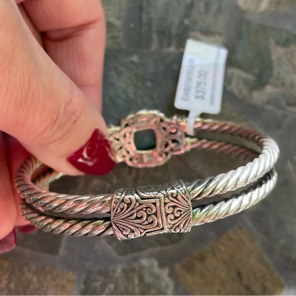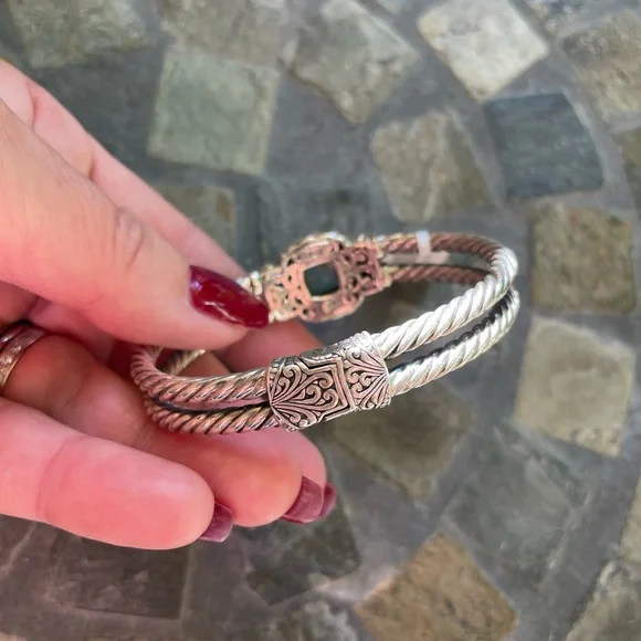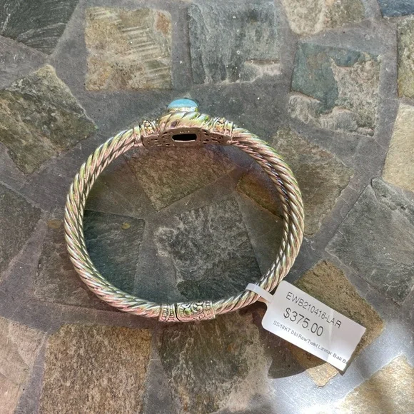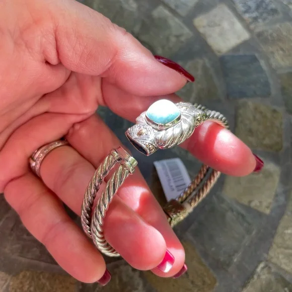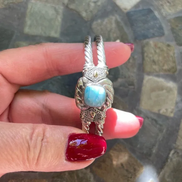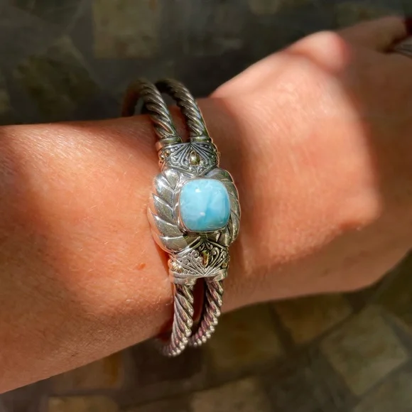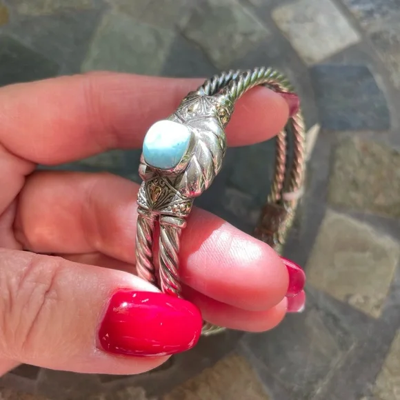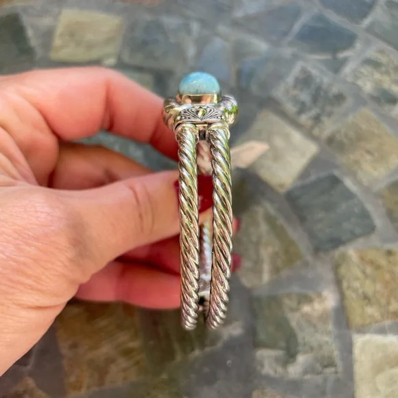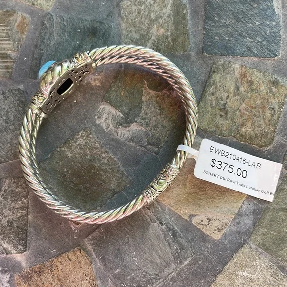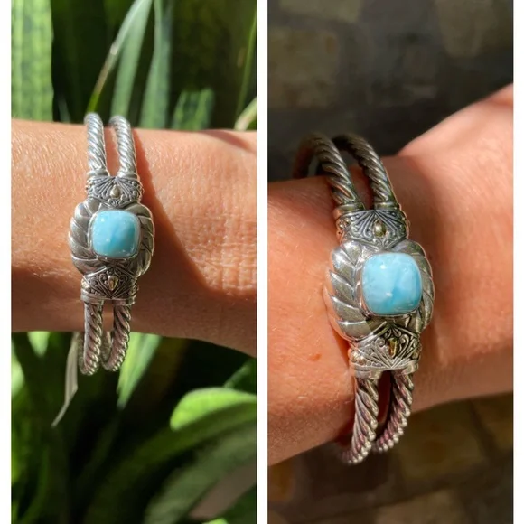 * SS/18K gold Bali Larimar cuff bracelet* sterling silver 925/18K gold * stamped 925/18K* stone: Larimar * double row twist bracelet* it’s 32.4g in weight * it’s 8” Circular* 18K details on top & sides of bracelet* spring back opening * opening on top * beautiful details inside and out of bracelet * please check all pictures for details and video