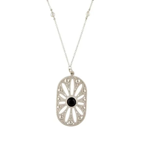 Sterling Tiffany & Co. Ziegfeld Sterling daisy pendant necklace featuring round black onyx and near perfect round cultured pearls.Chain length 24 inches, pendant width 0.7 inches,...