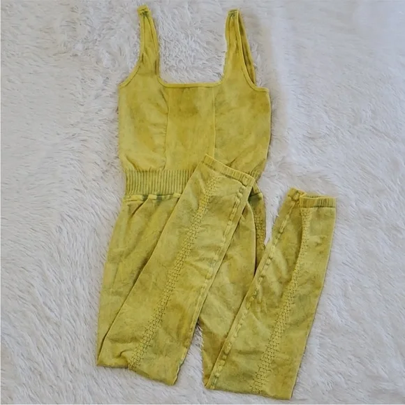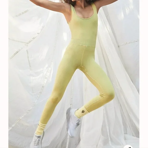 Elevate your style with this Free People jumpsuit, featuring a sleek, sleeveless design in a soft pastel yellow. Crafted from a stretchy fabric, it offers a smooth, body-contouring fit that extends to the ankles. Perfect for a minimalist look, this jumpsuit is a versatile addition to any wardrobe.mll-73% nylon, 27% spandex -- MSRP $98- New without tags- Color: Washed Black- 7/8 cropped length- Form-fitting silhouette- Stretch fit