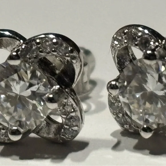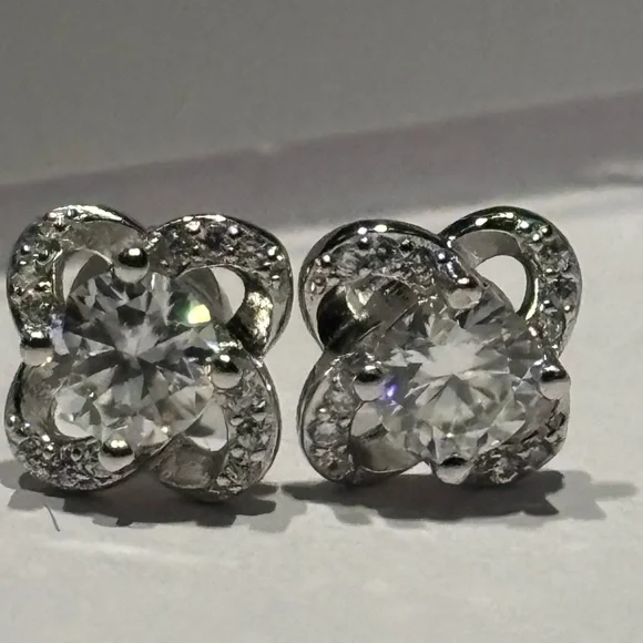 Fine Jewelry Rhodium Electroplated 925 Genuine SilverEar post off centered.Rhodium (Rhodium, a silver-white precious metal, is a member of the platinum group and is obtained commercially as a byproduct of copper and nickel refining. It´s found in nature as a free metal or as an alloy with other metals, and it´s known for its high reflectivity and resistance to corrosion.) “Genuine” 925 silver; 925 silver, also known as sterling silver, is an alloy composed of 92.5% pure silver and 7.5% other metals, typically copper, to enhance its durability and workability. Moissanite Studs Clover designNow, “Moissonites are typically flawless. In comparison to Saphires and Diamonds that can have inclusions” …which can interrupt a stones radiance. “Moissonites were discovered by Henri Moissan. Examining Meteor Crater 120years ago.” So basically they are kind of Galactic; Or, I see it that way anyhow.These diamonds appear to have a cloudinessNot flawlessRound Brilliant Approximately 1cttwMoissanite & Diamond Moissanite on 935 silver haloPush backsHypoallergenicWilling to moderately negotiateFree with $1000 purchase.Offers Considered
