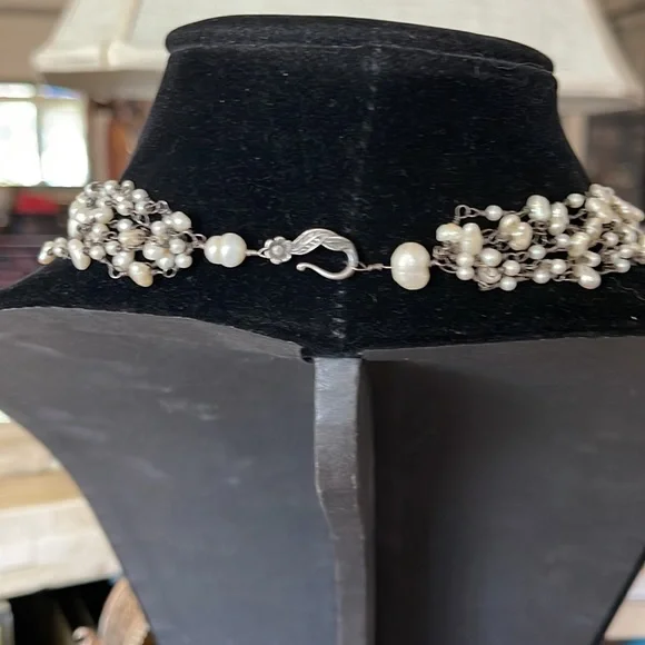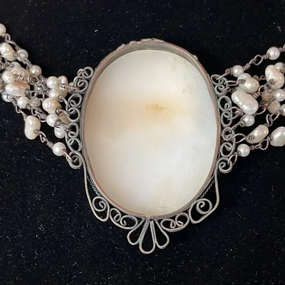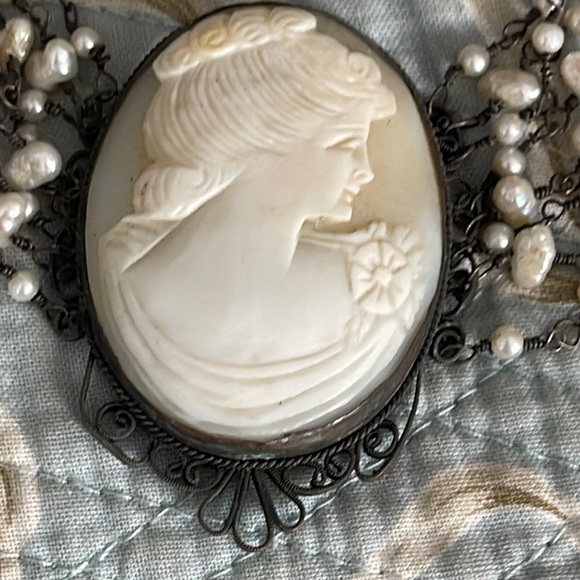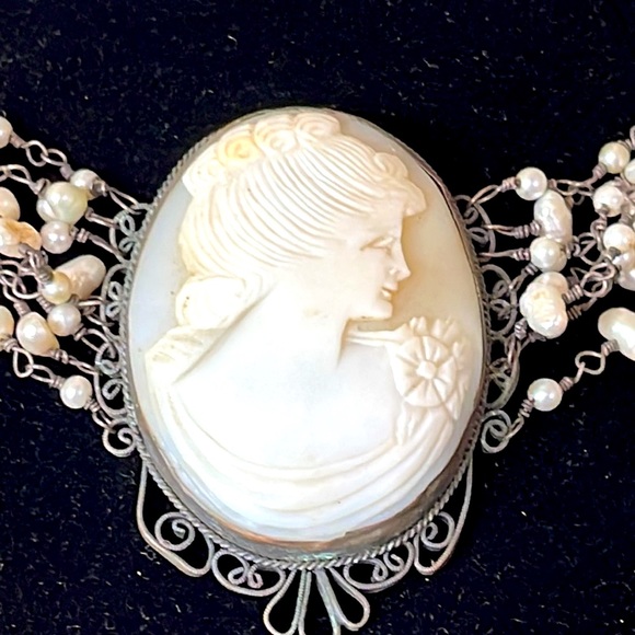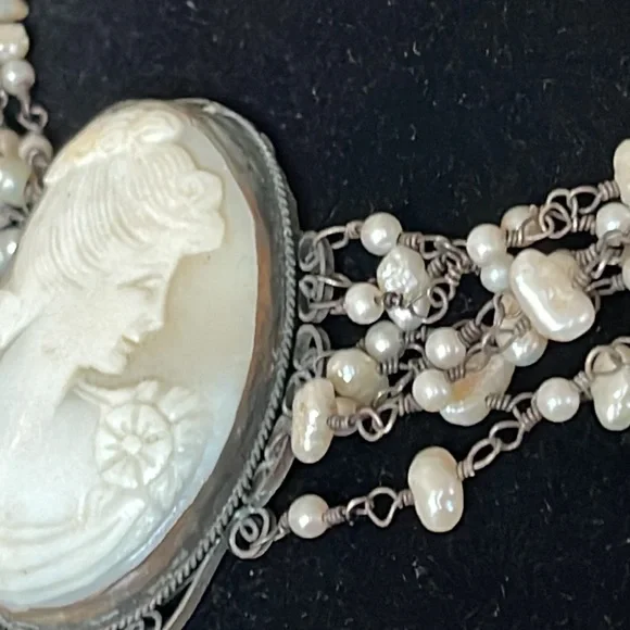 Cameo is real and very old incorporated into this very beautiful piece Clasp and all wire is sterling silverSterling silver floral motif S hook clasp attached to the larger pearls on both sides Very beautiful feminine piece that looks amazing on your neck