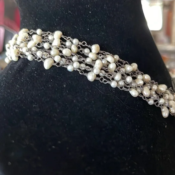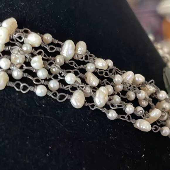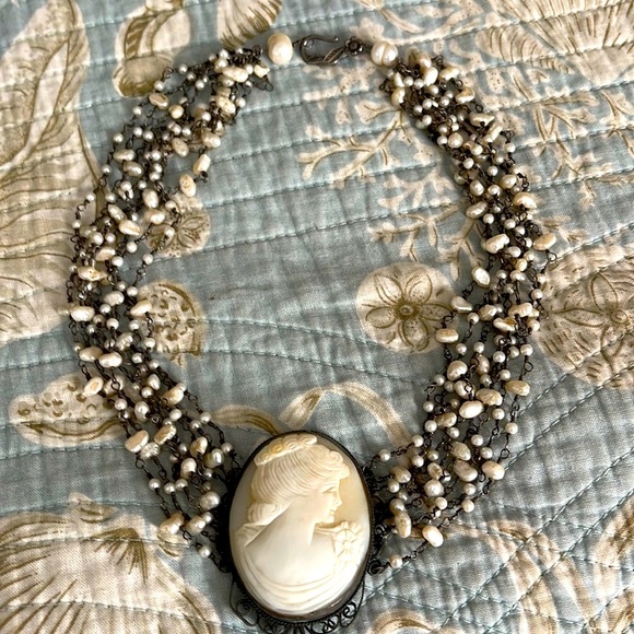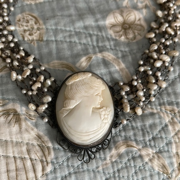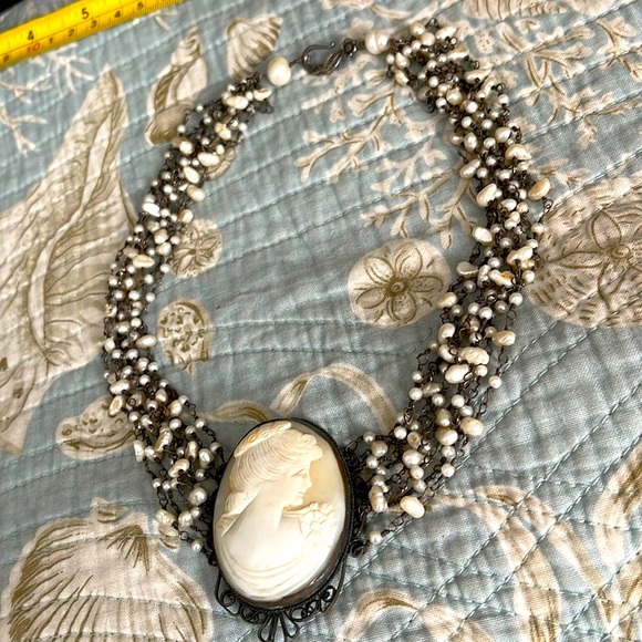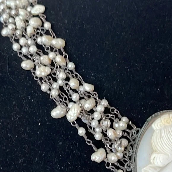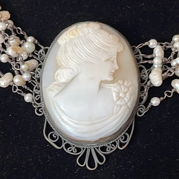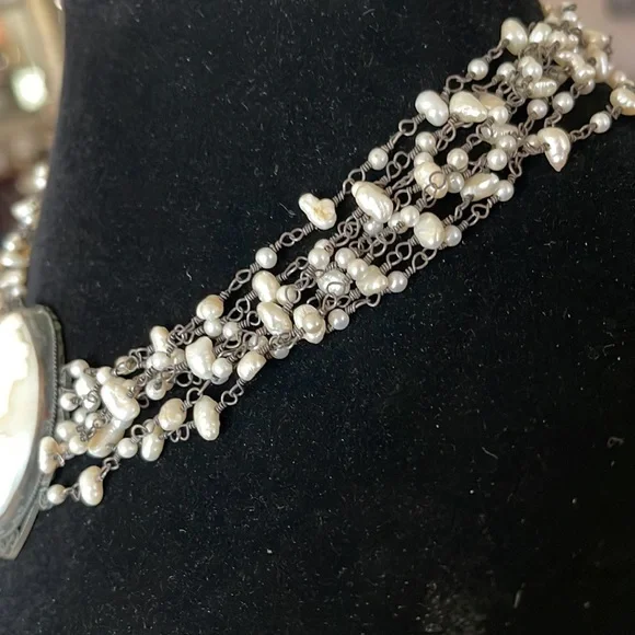Large romantic cameo necklace sterling fresh water pearls 16 rows hand wrapped