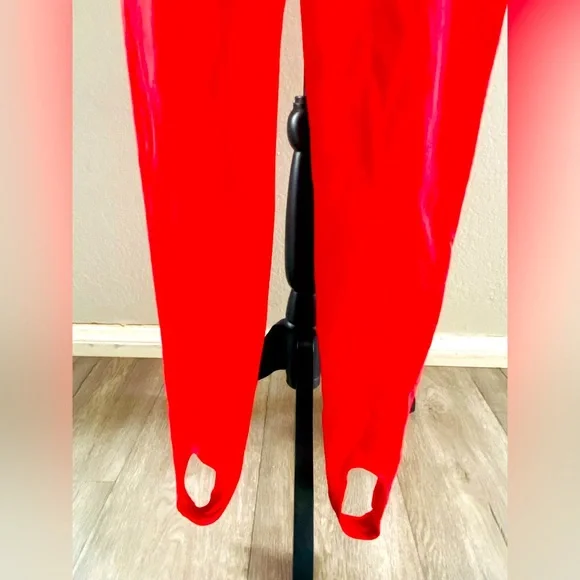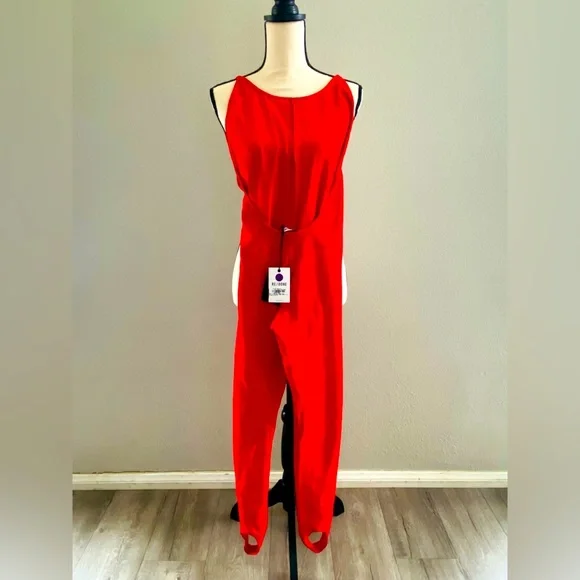 Red head to feet jumpsuit new with tags length is approximately 51 inches. Open back Stretchy material with sample runway tags no care tag. Piece is unique and not easily available.