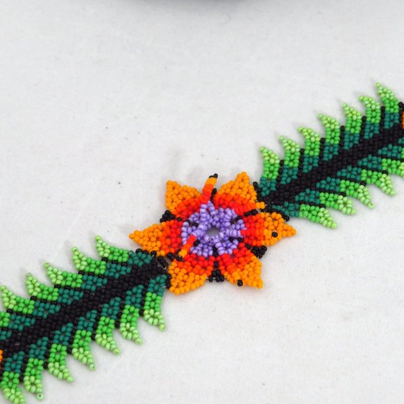 Huichol style hand beaded colorful necklace and bracelet set. Handcrafted glass beads choker.Choker 15 1/2", magnetic claspBracelet 7 1/4", beaded clasp