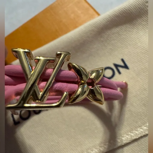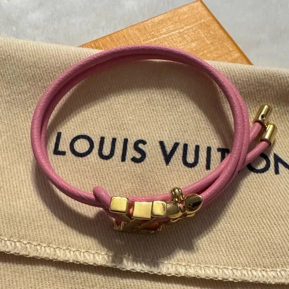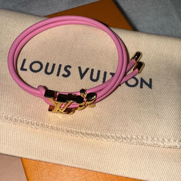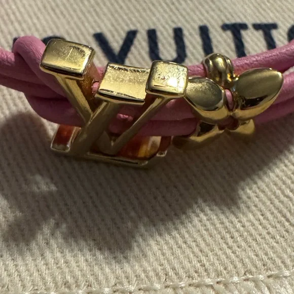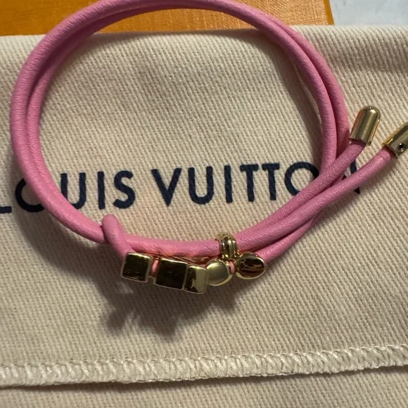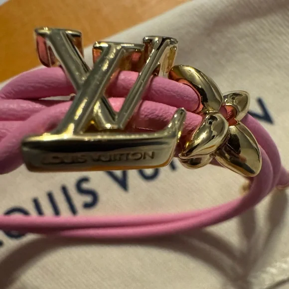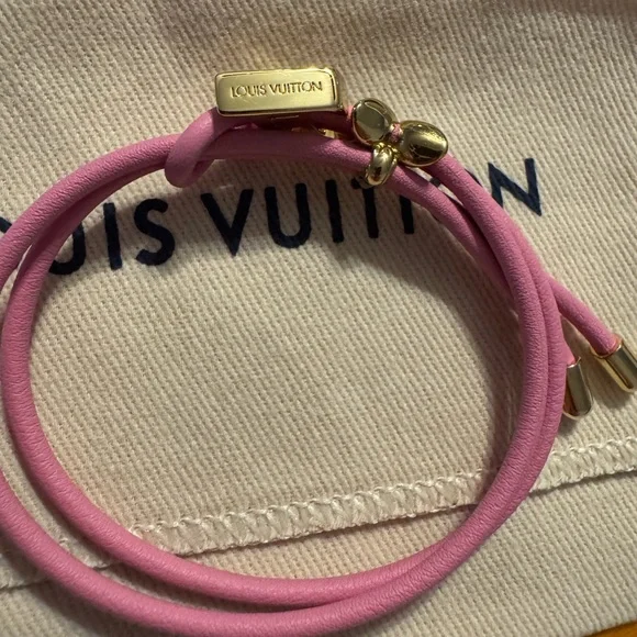 Elegant pink bracelet with gold accents from Louis Vuitton. Stylish and chic.New on website! New release!Get it here cheaper than online. I thought I was a bracelet person and I can’t wear bracelets on my wrist. I don’t live near Louis Vuitton so I miss the return.My loss your win!!