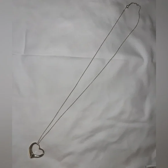 Elsa Peretti for Tiffany and Co. open heart pendant in sterling silver. 30” chain and 36 mm wide pendant. Sold in original packaging. No longer sold in store.