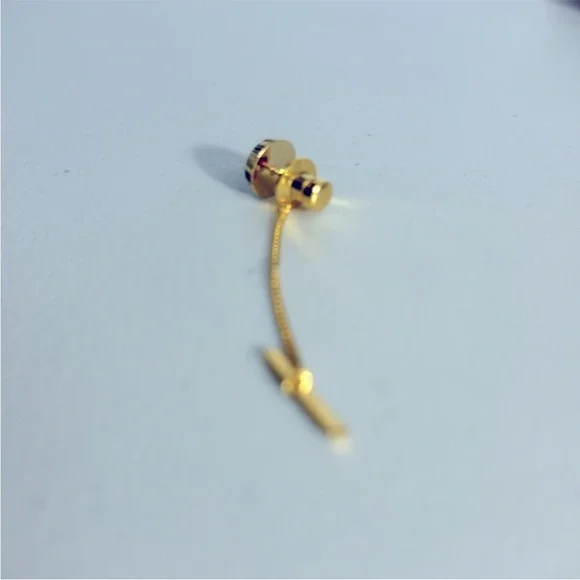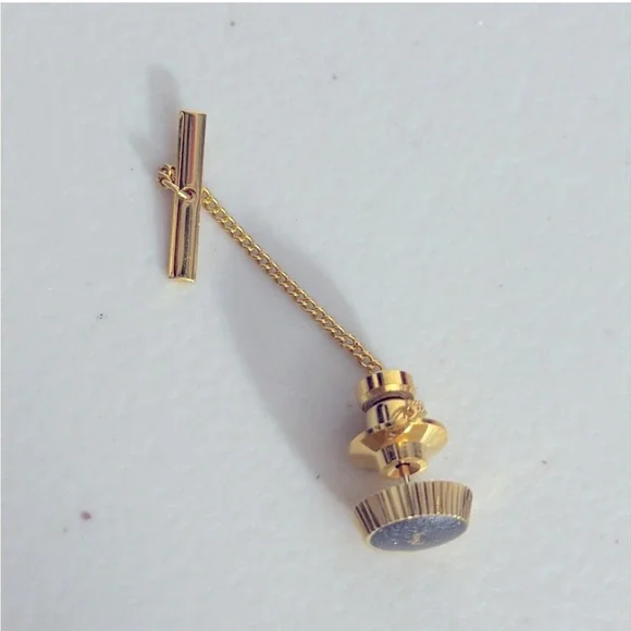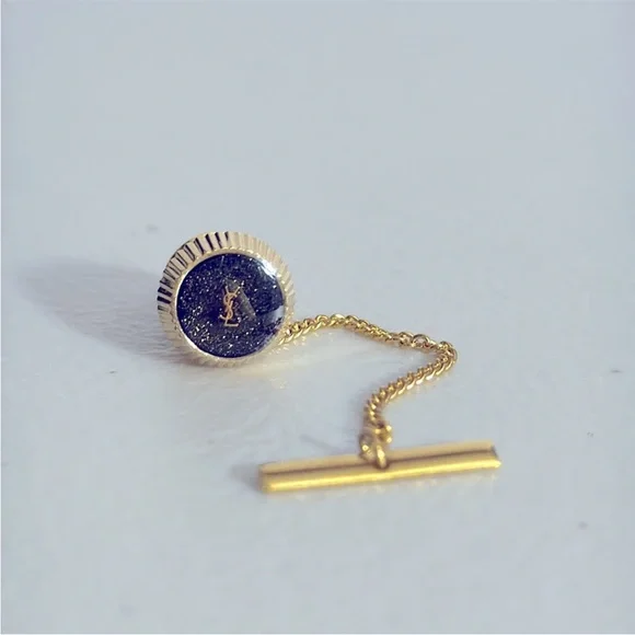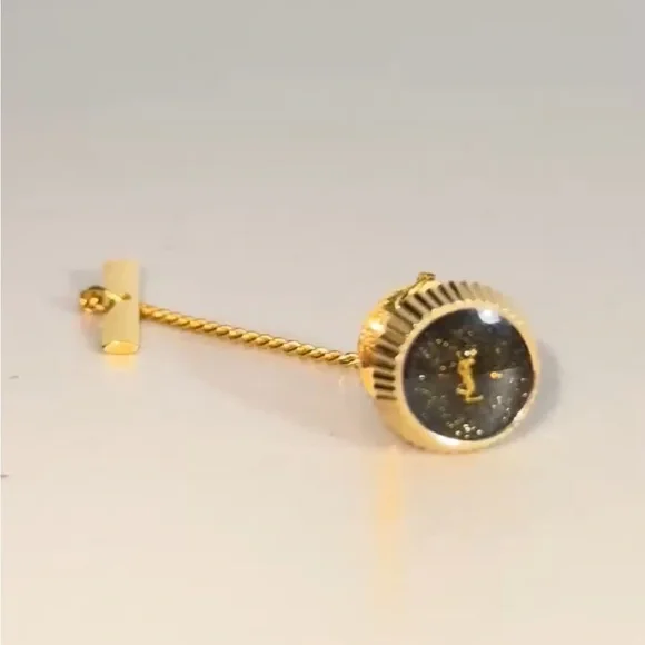 This exquisite Yves Saint Laurent brooch showcases a blue glittering stone encased in an intricate gold designed frame. It can be used as a tie clip or brooch, a beautiful accessory to accent your wardrobe.