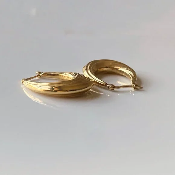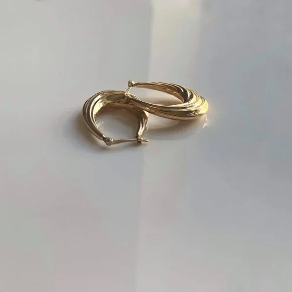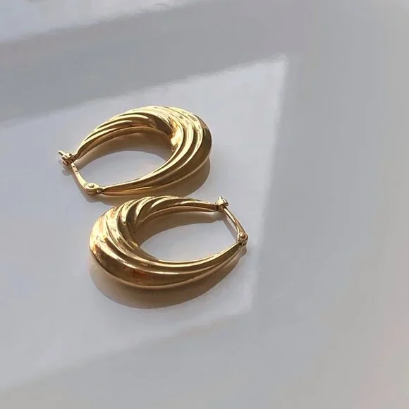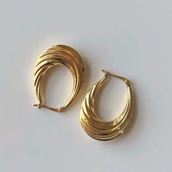14k Solid Yellow Gold Fluted Oval Hoop Earrings Hallmarked Real Gold Jewelry