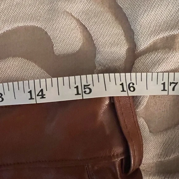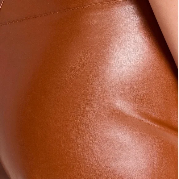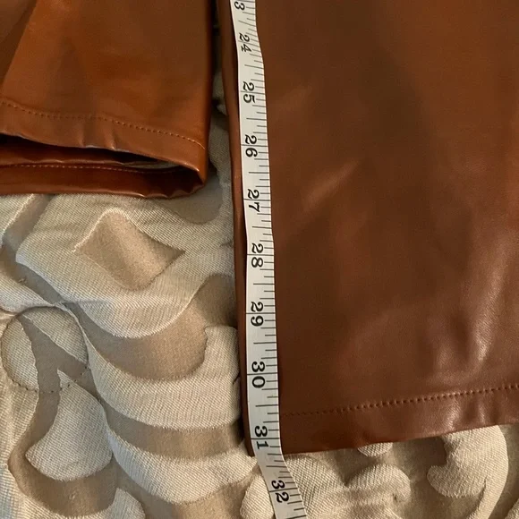 Fabric: Mid-weight, super-stretch faux leatherFleece backingHook-and-eye closures at waist, zip flySlant hip pocketsShell: 50% polyester/50% polyurethaneSpot cleanMade in the USAVery soft & stretchy. See pictures for measurements.