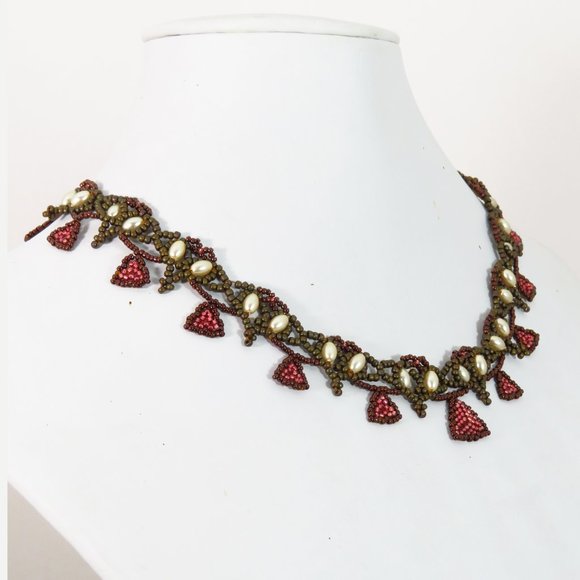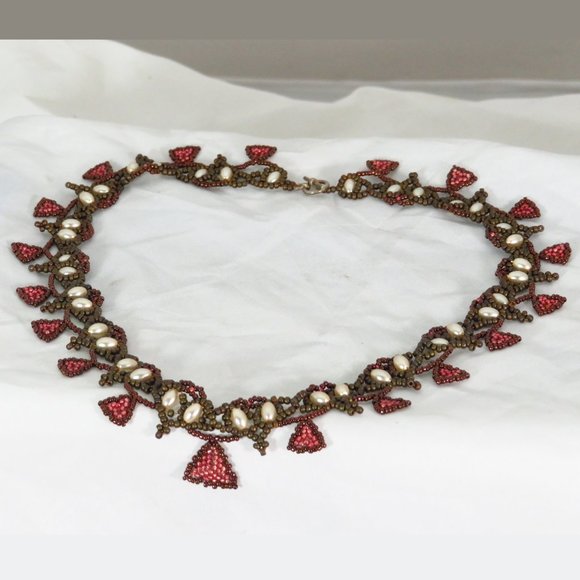 Small oval shaped cream glass pearls are offset in a repeating pattern modeled on the 1920´s vintage Art Nouveau style of jewelry. Colors are matte bronze, antique copper, and silver lined hot pink. This piece can be worn with most neckline shapes because of its short length (not quite a choker, but close!).Handmade itemNecklace length: 17 1/2 Inches; Pendant height: 1/2 Inches; Pendant width: 1/2 InchesMaterials: GlassClosure: Toggle
