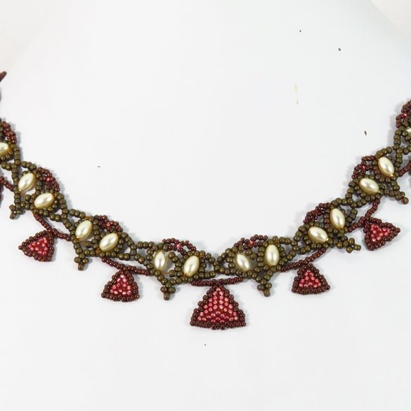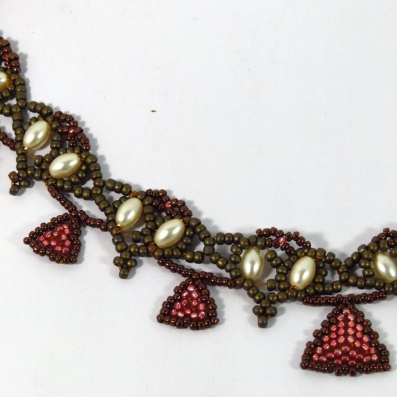 Small oval shaped cream glass pearls are offset in a repeating pattern modeled on the 1920´s vintage Art Nouveau style of jewelry. Colors are matte bronze, antique copper,...