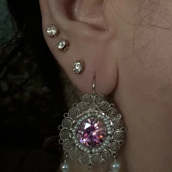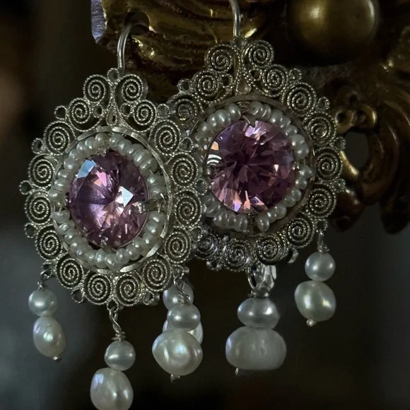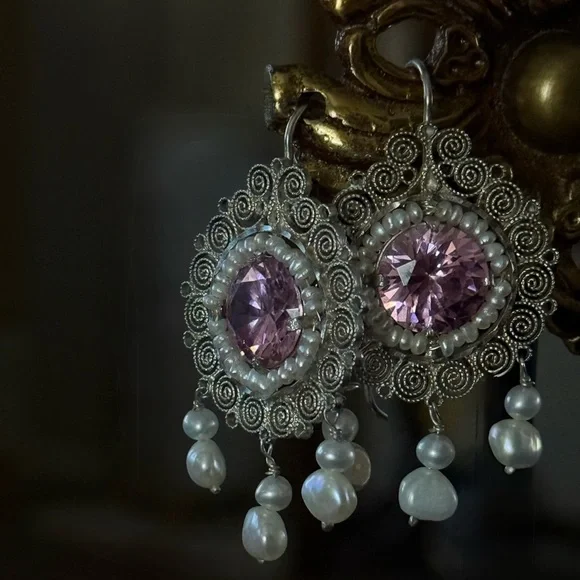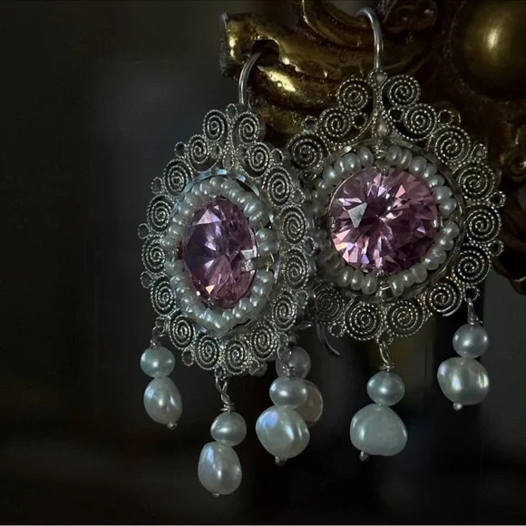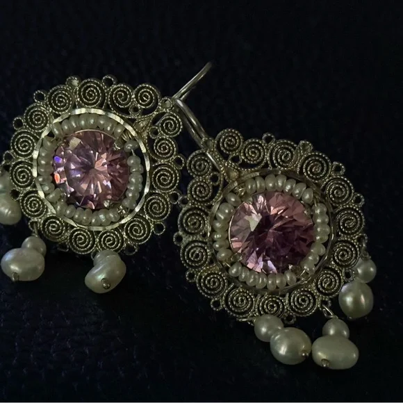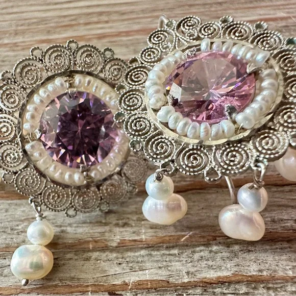 These earrings offer a whisper of old-world romance and the timeless craftsmanship of Mexico’s most revered silversmith traditions. A captivating pair of vintage earrings from the masterful hands of Carlos Gutierrez of Oaxaca, Mexico. These breathtaking treasures are a celebration of traditional Mexican filigree—each delicate swirl handcrafted in sterling silver, circling a brilliant pink faceted stone that glows with a warm, romantic light.Encircling the central stone is a dainty halo of luminous seed pearls, each one hand-set with care and precision. The earrings are adorned with three graceful pearl drops that dance with every movement, catching the light like dewdrops in dawn’s first blush.Measuring just under 2 inches in length and approximately 1 inch wide, these earrings are dramatic yet airy, light on the ear but rich in heritage. A stunning example of mid-century Oaxacan artistry—equal parts heirloom and statement.