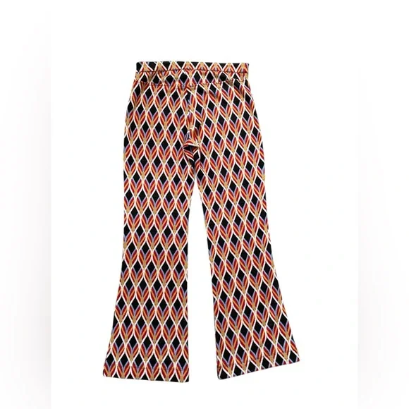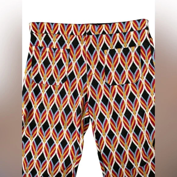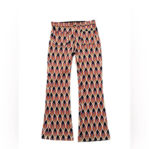 Good condition Size 8Front pocketsFlares legClosure zipper,buttons Waist 16”Inseam 32”Rise 10.5”Machine wash69% polyester,30% rayon,1% spandex Vibrant geometric pattern. Flare leg design. Stylish and bold.A23