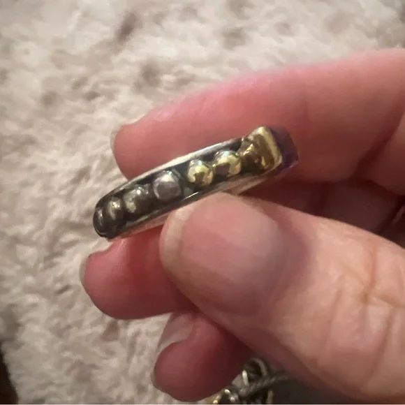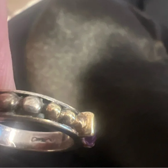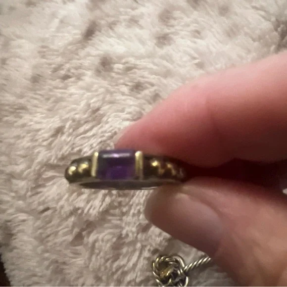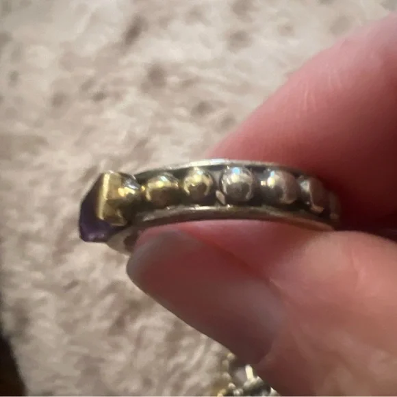 Stunning amethyst gemstone set in a sterling silver and 18k gold band.Adds sophistication to any look.