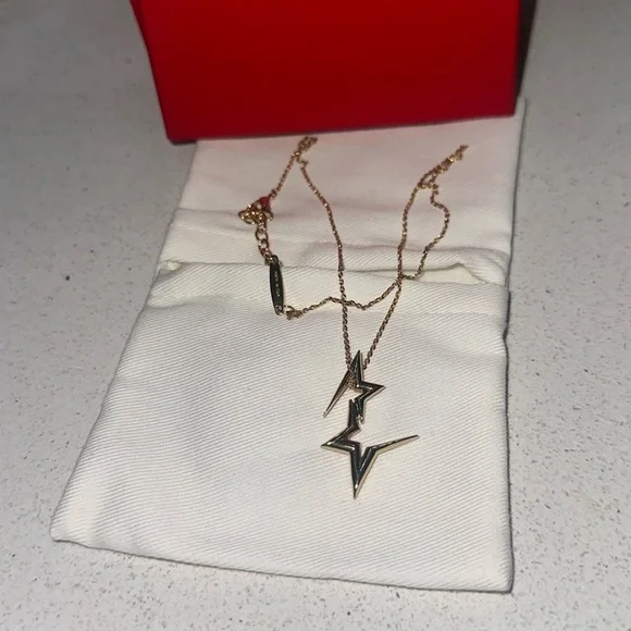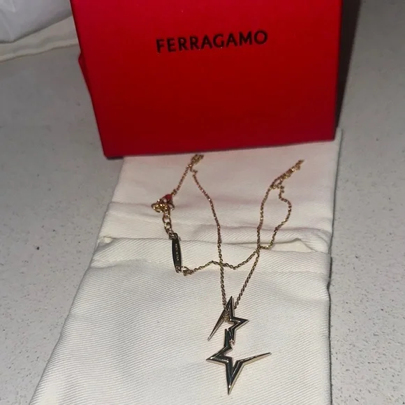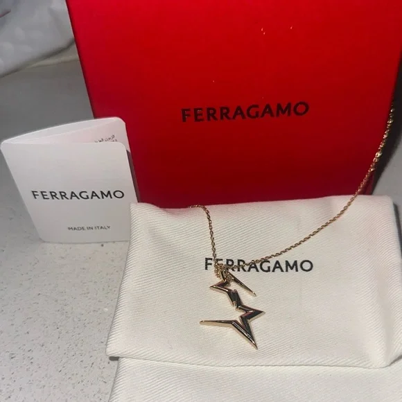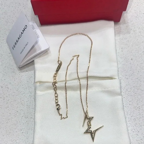 Elevate your style with the Salvatore Ferragamo Gold la double Star Necklace. Material: gold over 100% brassAdjustable lobster-clasp closureDouble star pendantGold-tone hardwareMade in ItalyThis stunning piece features a unique stars design, perfect for adding a touch of elegance to any outfit.Comes in original box with jewelry pouch and card