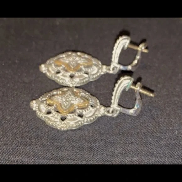 Elegant Judith Ripka designer 18k diamond and sterling silver earrings Beautiful floral filigree detailing.Safety closureMeasure approximately 1” in lengthEUCPlease see all pictures as part of description.All sales are as is and final