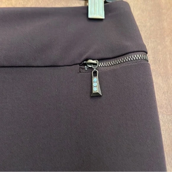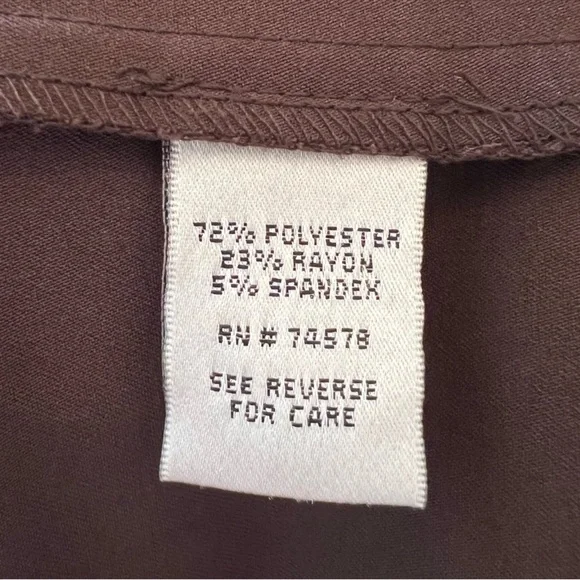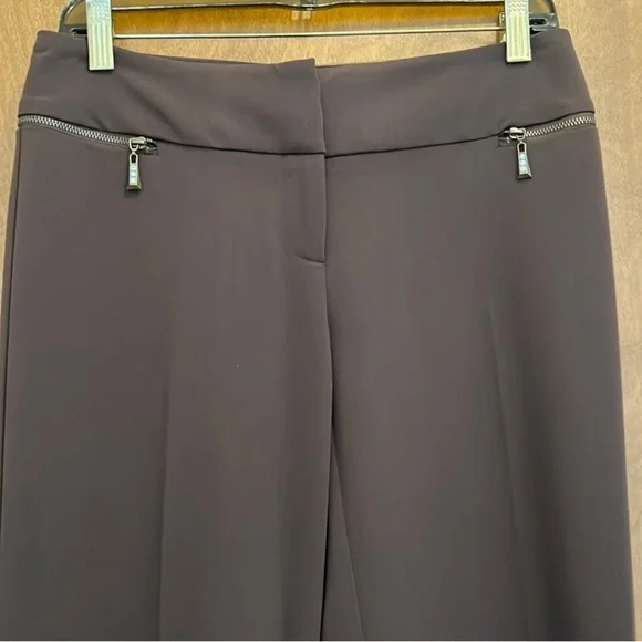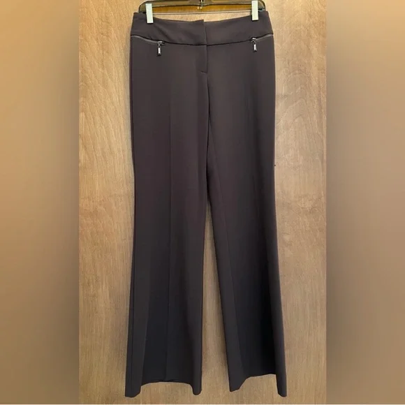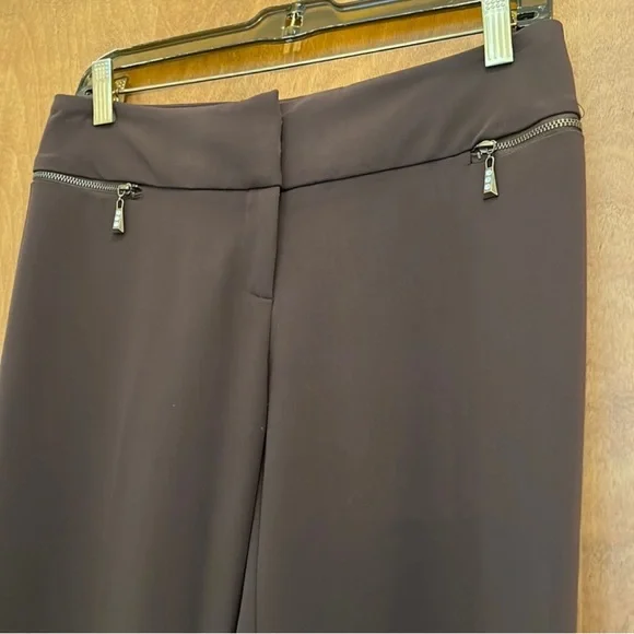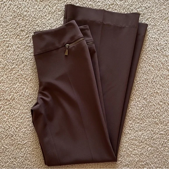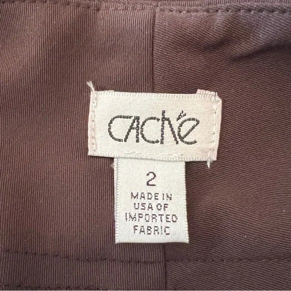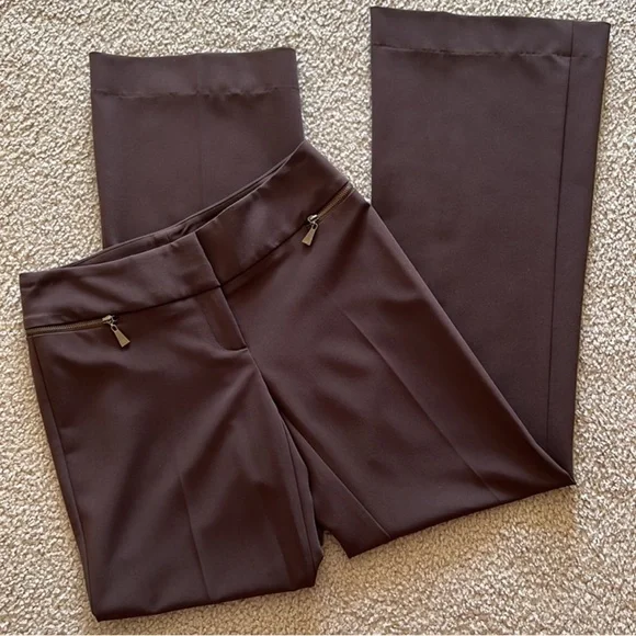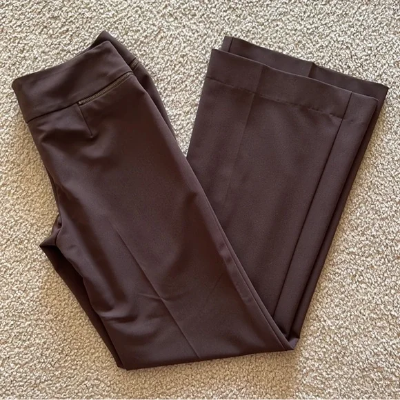 Experience the perfect blend of style and sophistication with these Cache brown flare pants. Featuring a flattering wide leg design, these pants are crafted from a structured fabric that offers a polished look for any formal setting. The wide waistband ensures a comfortable fit, making them an ideal choice for business-casual occasions. Inseam approximately 30”.Pants are hemmed but never worn.